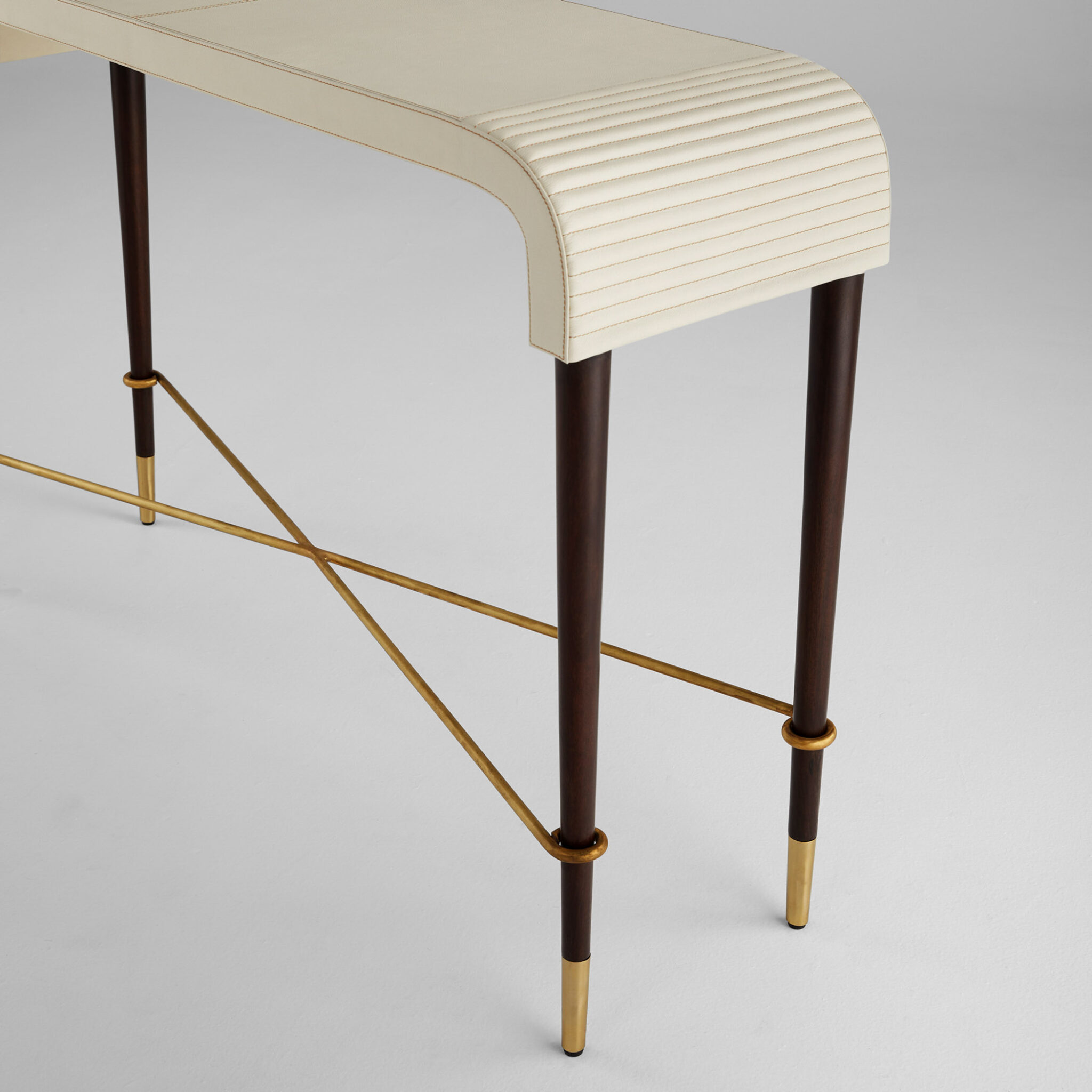 The Channel Console Table combines light beige pebbled leather with a quilted, horizontal pattern which waterfalls gracefully over the edge of the table. Brass sabots?cap each leg, adding a sophisticated detail. Brass stretcher bars wind gracefully?around each tapered walnut leg?to provide stability and support.