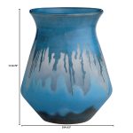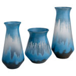 A blue reactive glaze flows into a clear frosted ombre on the Chuva vases, creating a textured, organic finish. The variations in each piece are shaped by the heat, with the glaze reacting differently to create distinct patterns and depth, making each vase a unique work of art. Available in two separate sizes.