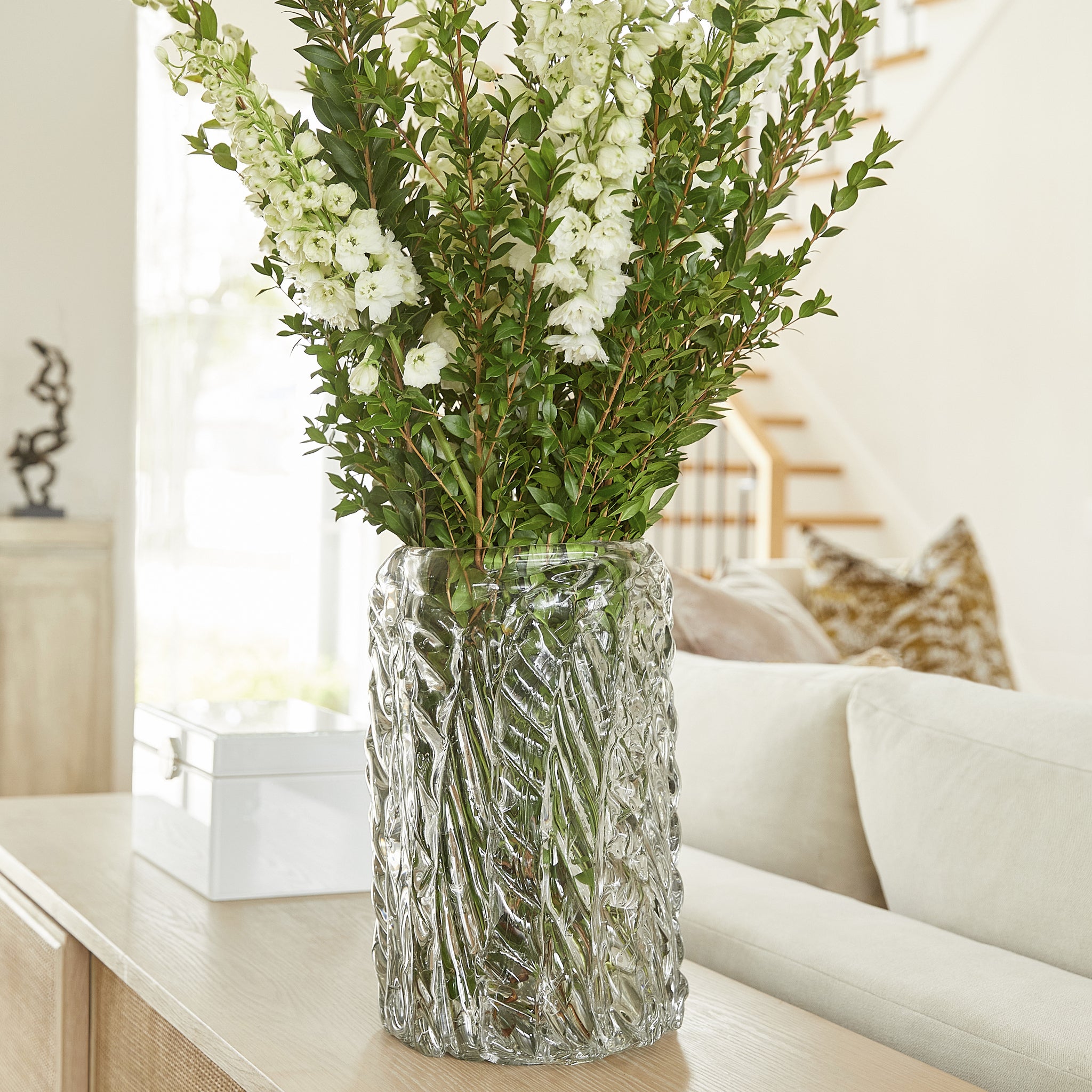 If you feel inspired by abstract expression and organized chaos, you`ll find this piece to fit perfectly within your style. Boasting a large glass composition, arranged in arbitrary formations, this clear tabletop vase is ideal for any mid-century modern or vibrant contemporary ensemble. Fill with your favorite seasonal floral arrangement atop your kitchen counter or display solo on your entryway table for a look that`s out of this world.