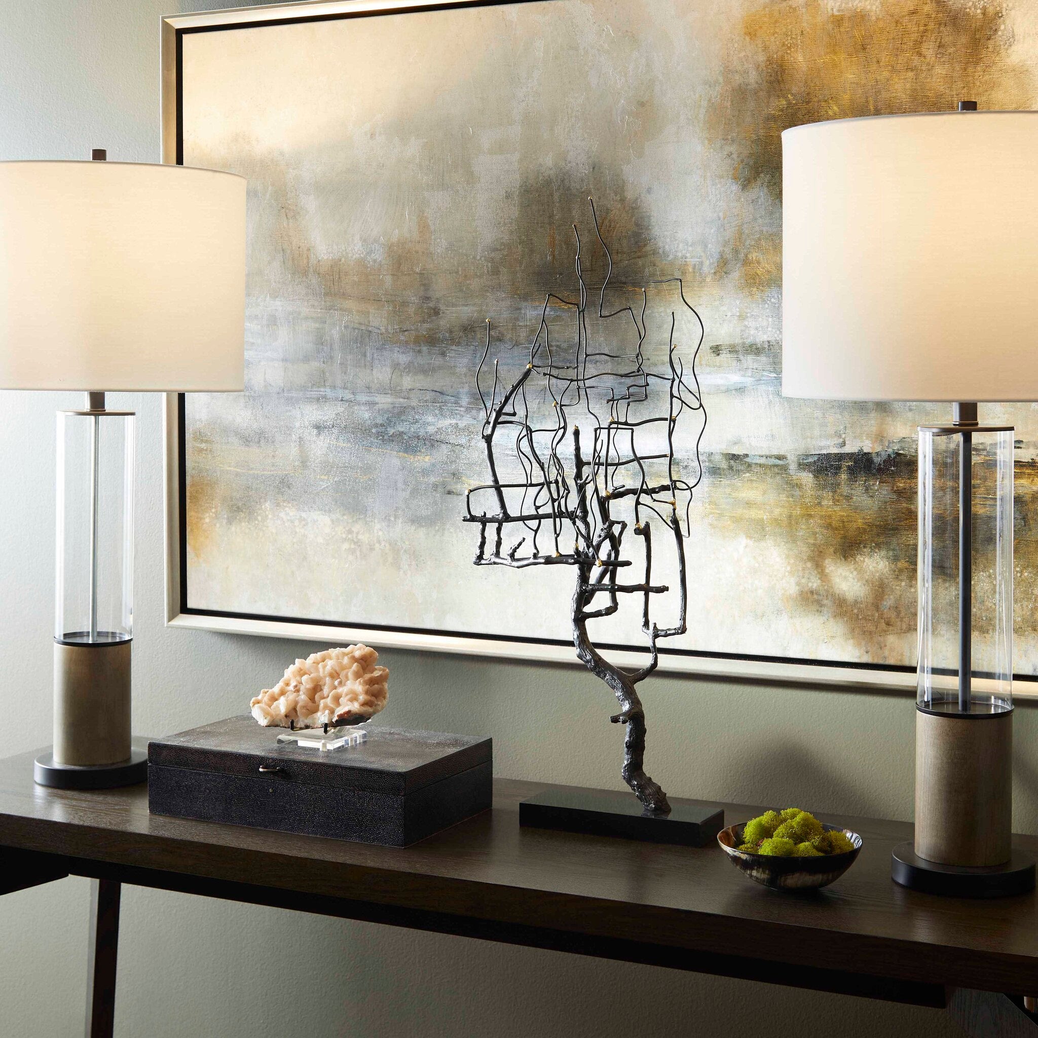 The stand out shape of this table lamp is reminiscent of 1920’s elegance. The Colossus table lamp boasts a generous proportion in its white linen shade. A single 100w medium base bulb provides ample illumination from the dimmable light source. Coupled with a gorgeous clear and pewter accents to complete the look of this luminary, the Colossus lamp is perfect for any modern bedroom, transitional entryway, or mid-century modern living room ensemble.