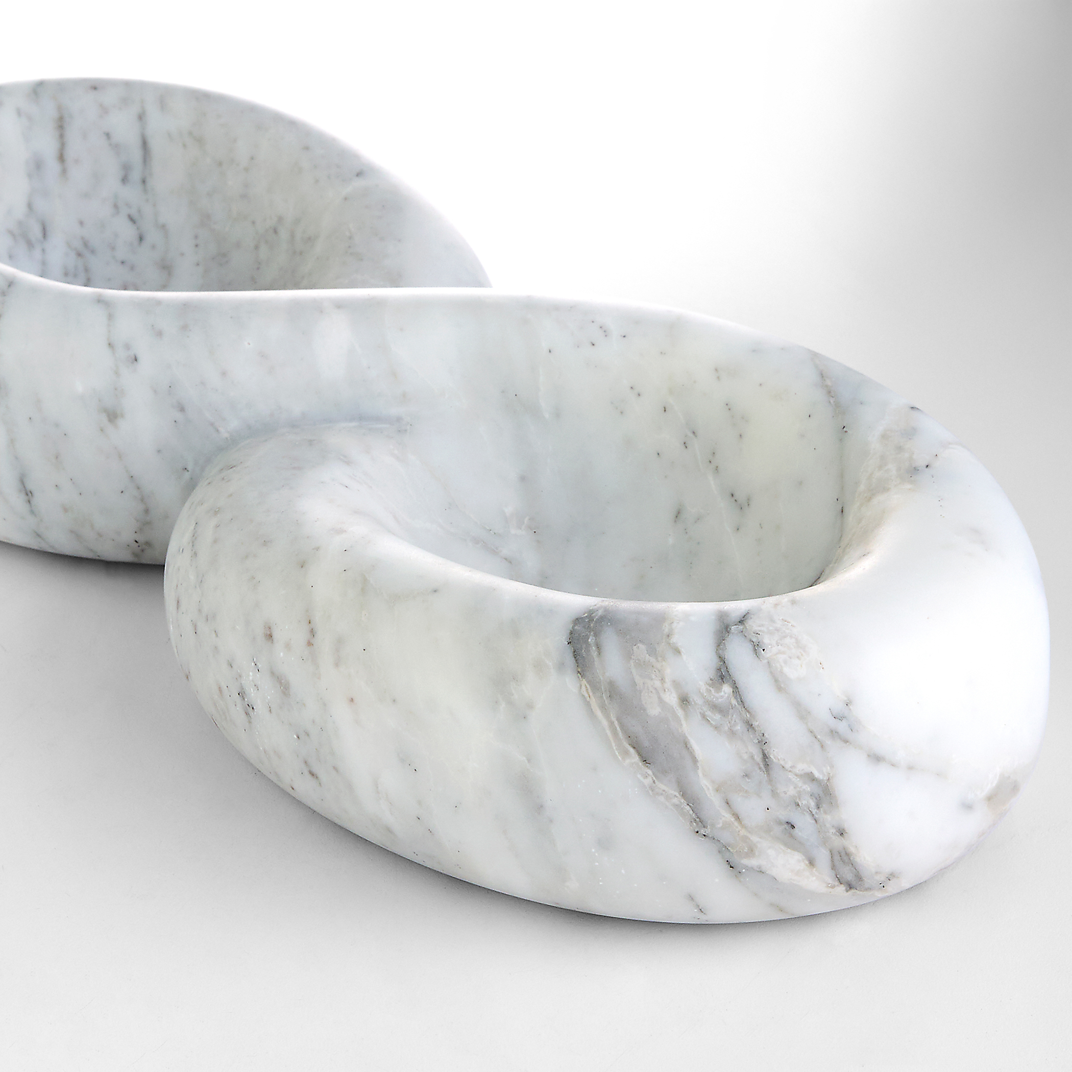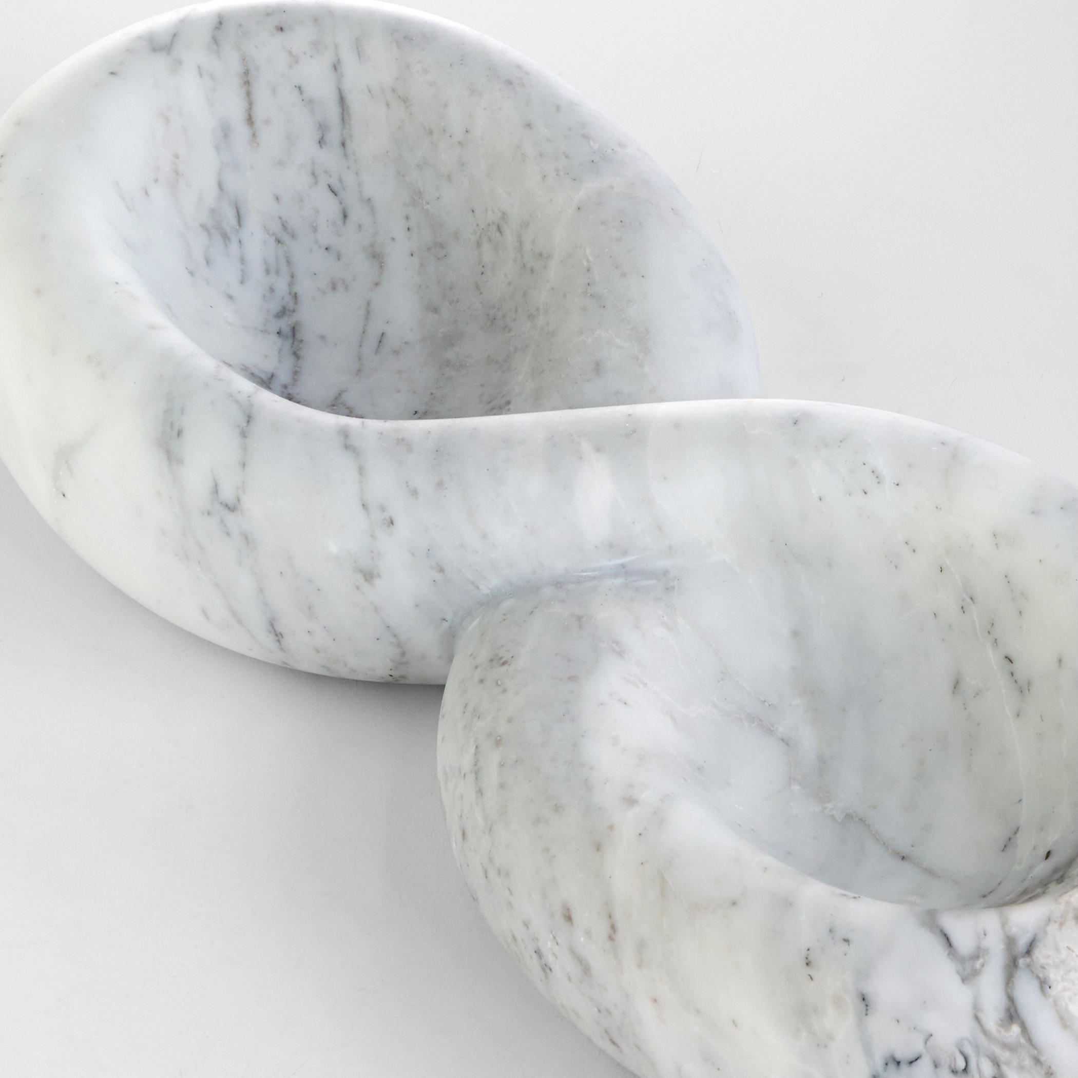 The Continuum Tray embodies simplicity in sculpture with a timeless, enduring presence. Crafted from exquisite white marble, its surface is adorned with intricate grey veining that winds and twists, adding depth and character. Perfect as an elegant catch-all, jewelry tray, or decorative accent, this piece seamlessly blends style with utility.