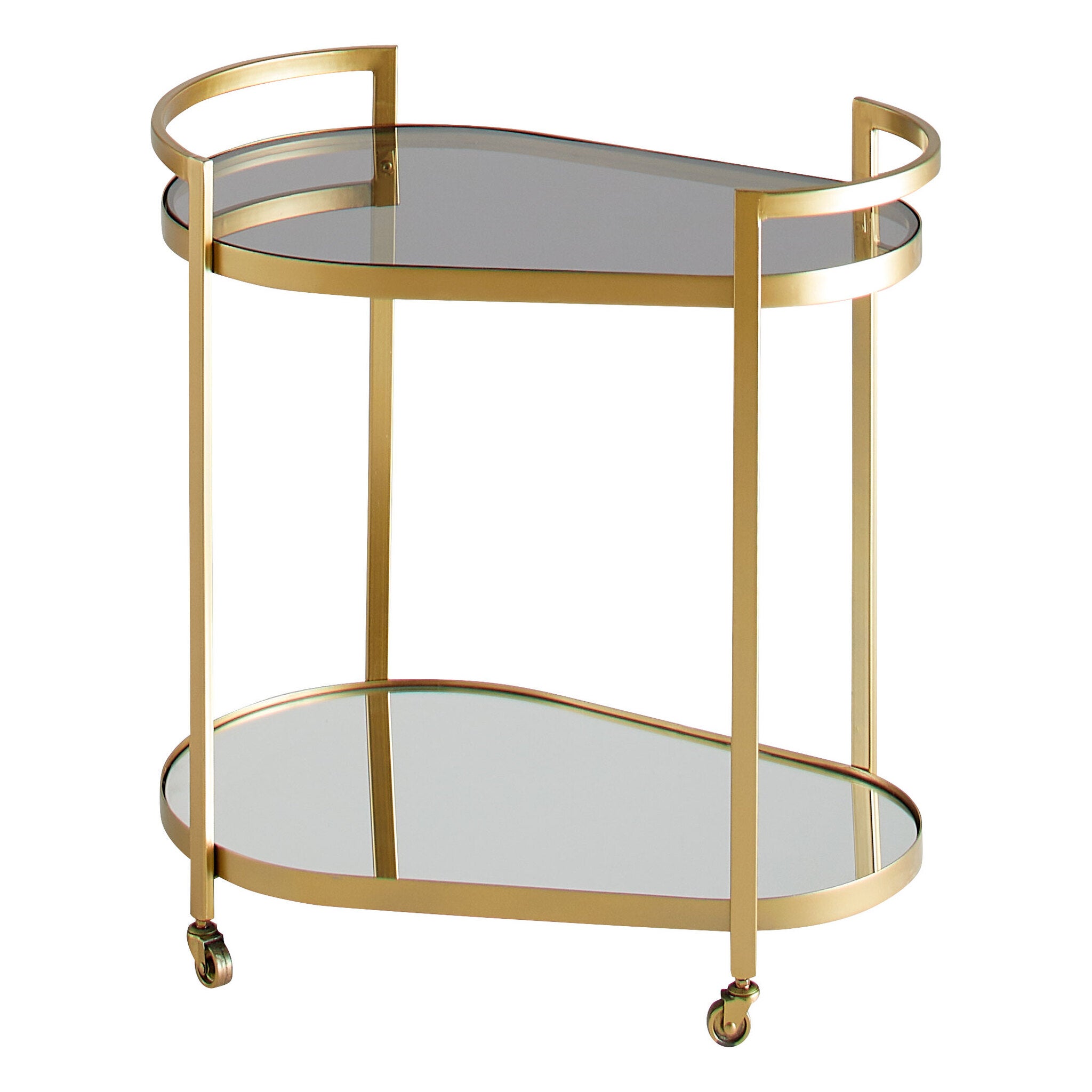 Provide bar service anywhere with the gold-finished, two-tier Cosmos bar cart. MDF-reinforced mirrored glass shelves are supported by a sturdy metal frame with four castored wheels, providing durability for frequent usage. The mid-century modern styling of the Cosmos bar cart produces an air of luxury befitting any kitchen, dining room, or social area.