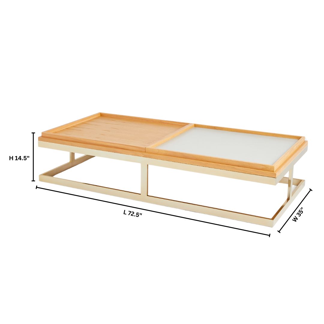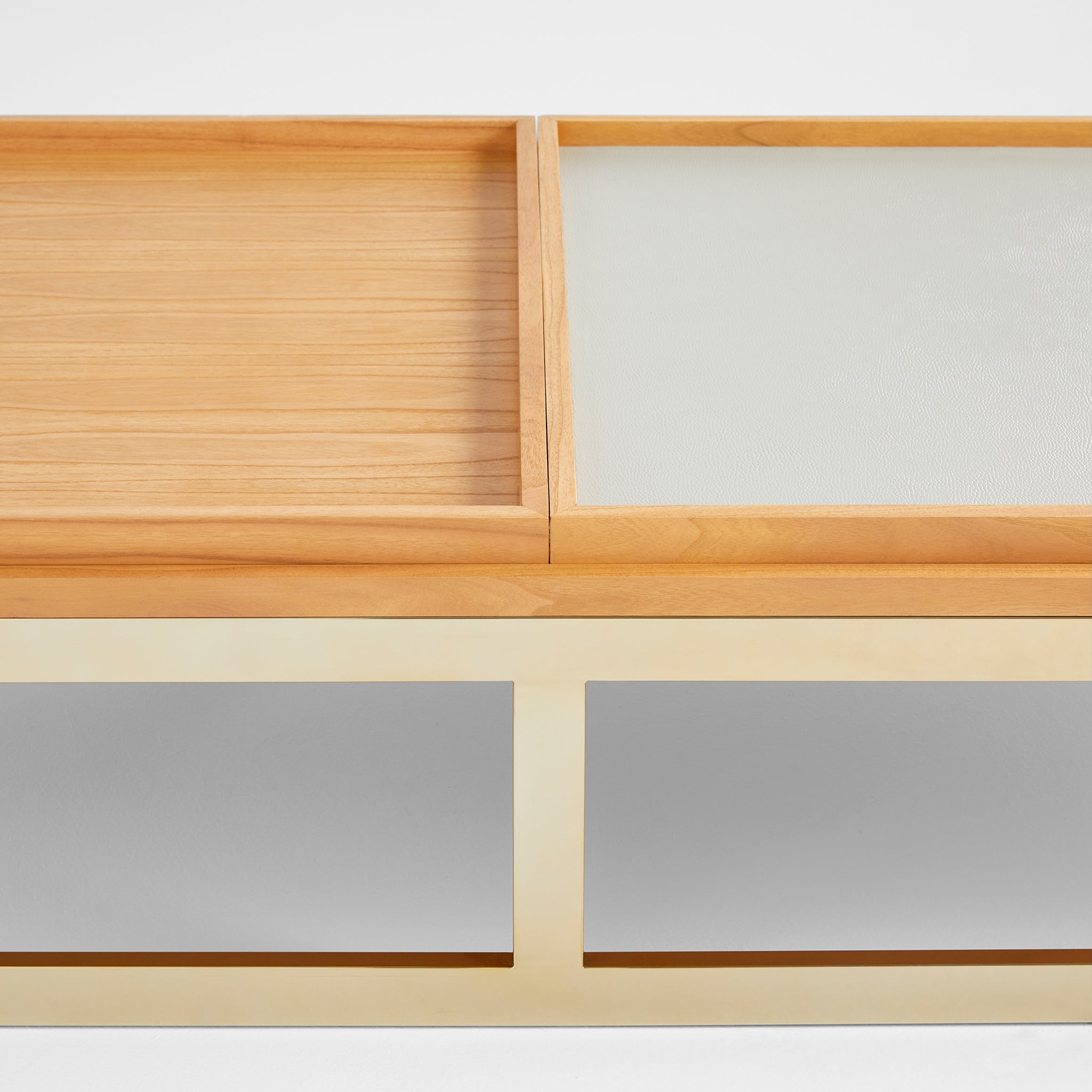 The Cosmopolita cocktail table features a brass-finished steel base that adds strength and style. The light Grandis wood veneer and solid wood edges showcase the collection’s commitment to sustainable materials. Crocodile pattern embossed leather-covered Grandis wood trays complete the allure of the Cosmopolita cocktail table design.