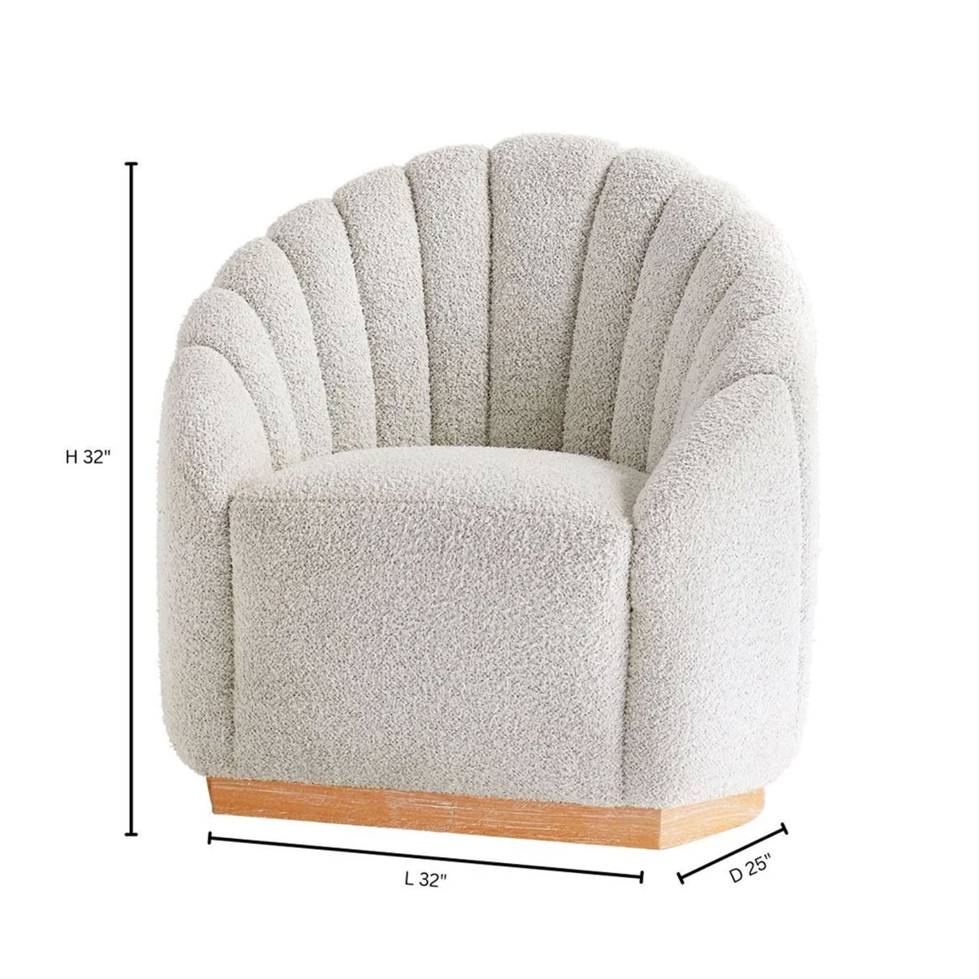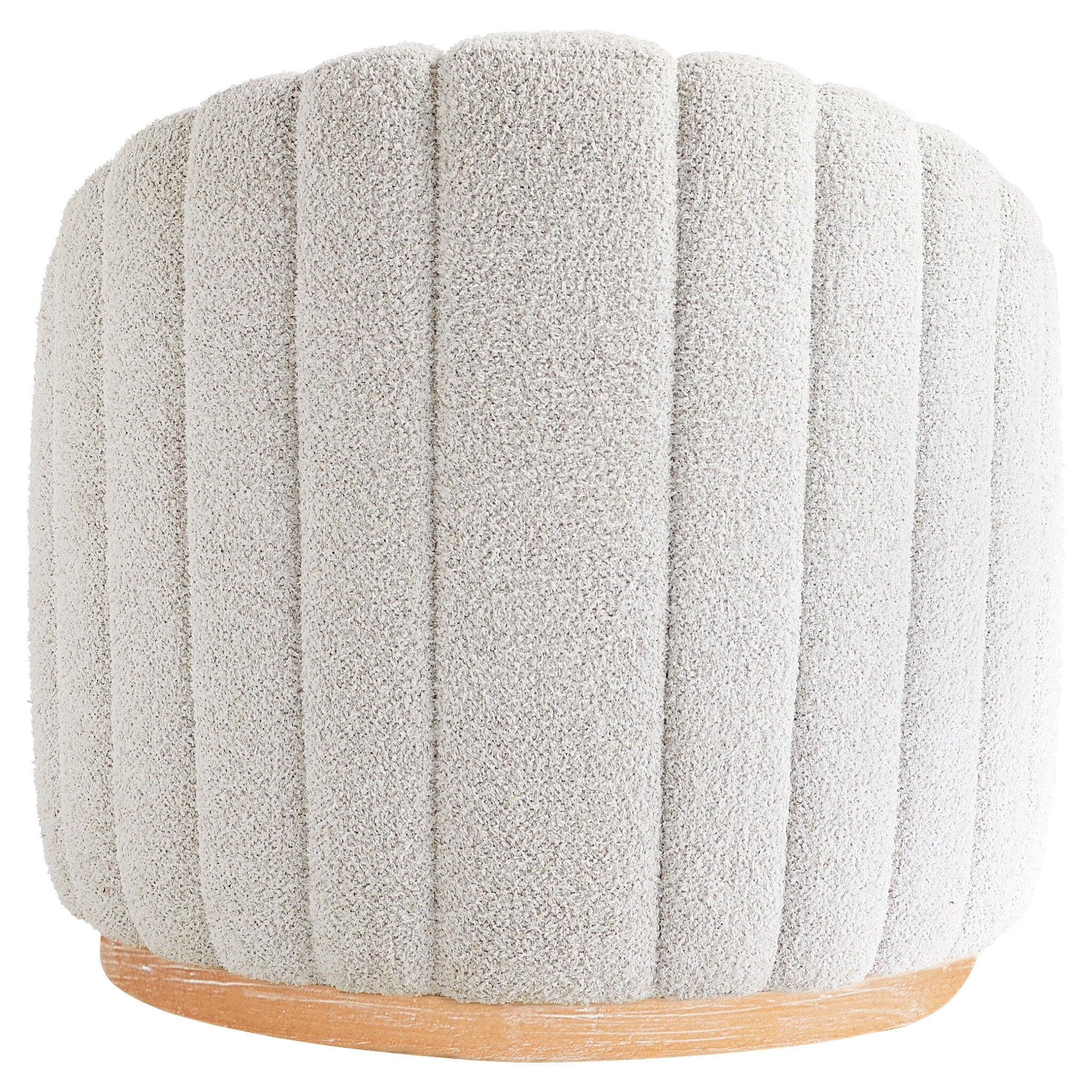 Derived from the Persian word for sea, the Daria swivel chair gained its namesake from the shell-motif channel tufting on its front, sides, and back. The vertical tufting meticulously follows the curvature of the frame, creating an arresting display of harmony. Off-white boucl? performance-treated fabric and a solid Oak wood base supply durability in this sturdy Mid-century design.