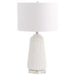 Sleek, smooth ridges bring incredible texture and refinement to this ceramic table lamp. Charming on a side table or decorating a nightstand, this engaging design features a crystal base with a white finish over ceramic construction. A white drum shade with a white lining continues a monochromatic theme, ensuring a clean and composed to complement modern living.