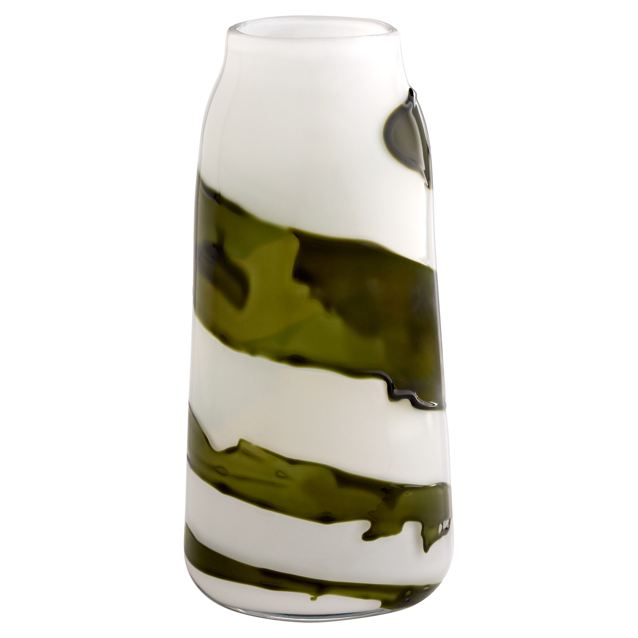 The Denali vases feature opalescent white swirled glass, with multiple shades of green carefully overlaid into a captivating design. Two artisans work together while the glass is still molten hot, layering each color individually to create this remarkable fusion of hues. Each vase is unique, with subtle variations in color and design.?Available in three separate sizes.