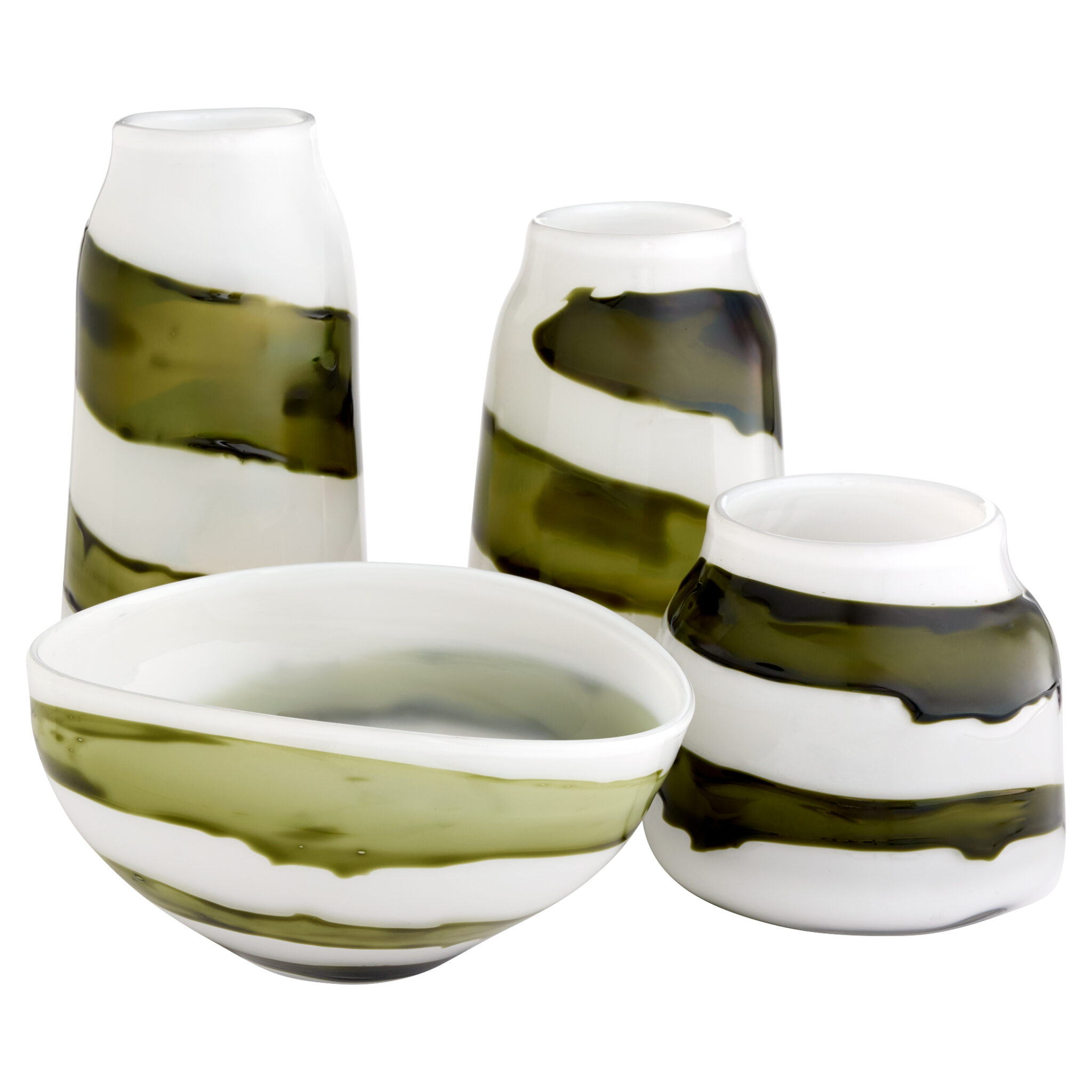 The Denali vases feature opalescent white swirled glass, with multiple shades of green carefully overlaid into a captivating design. Two artisans work together while the glass is still molten hot, layering each color individually to create this remarkable fusion of hues. Each vase is unique, with subtle variations in color and design.?Available in three separate sizes.