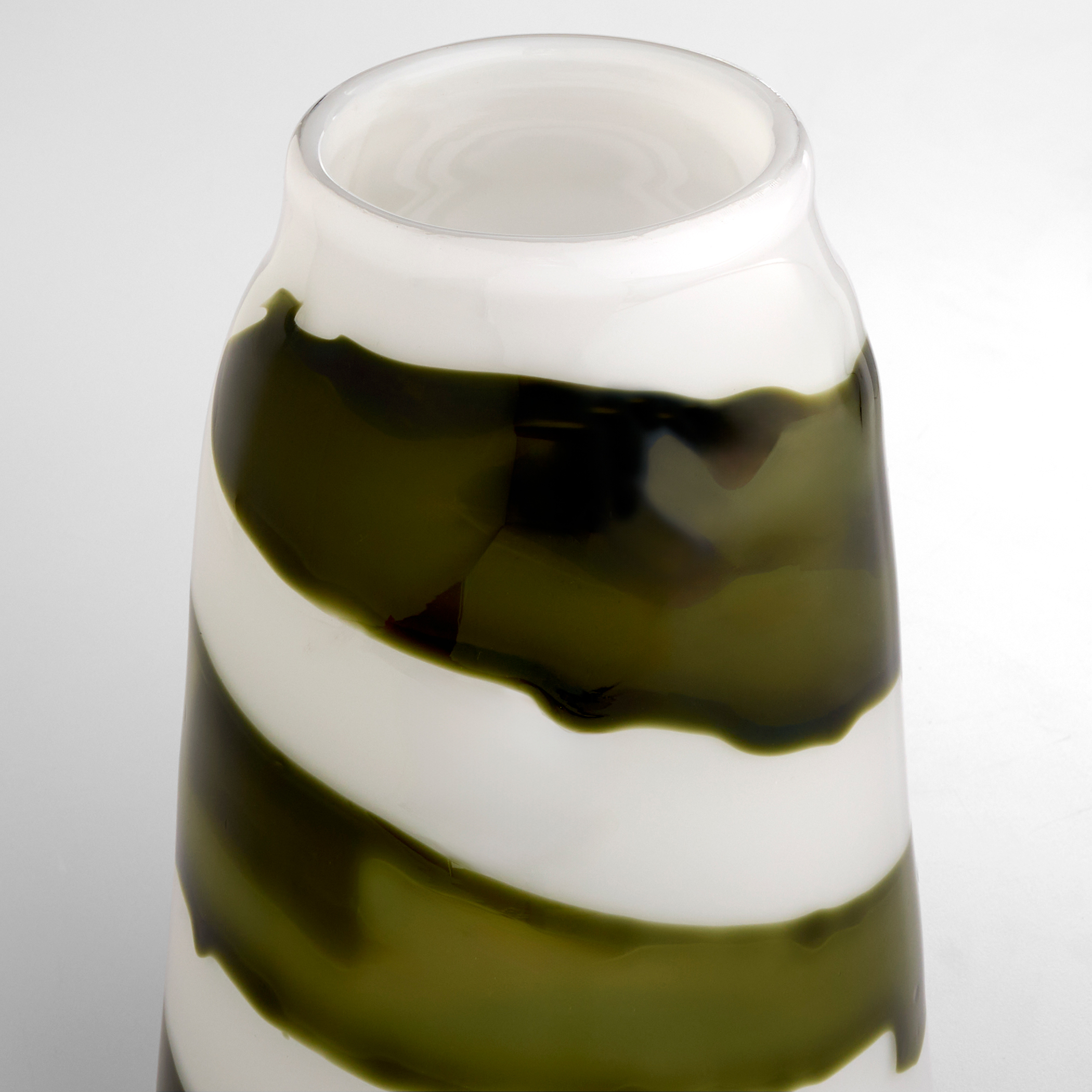 The Denali vases feature opalescent white swirled glass, with multiple shades of green carefully overlaid into a captivating design. Two artisans work together while the glass is still molten hot, layering each color individually to create this remarkable fusion of hues. Each vase is unique, with subtle variations in color and design.?Available in three separate sizes.