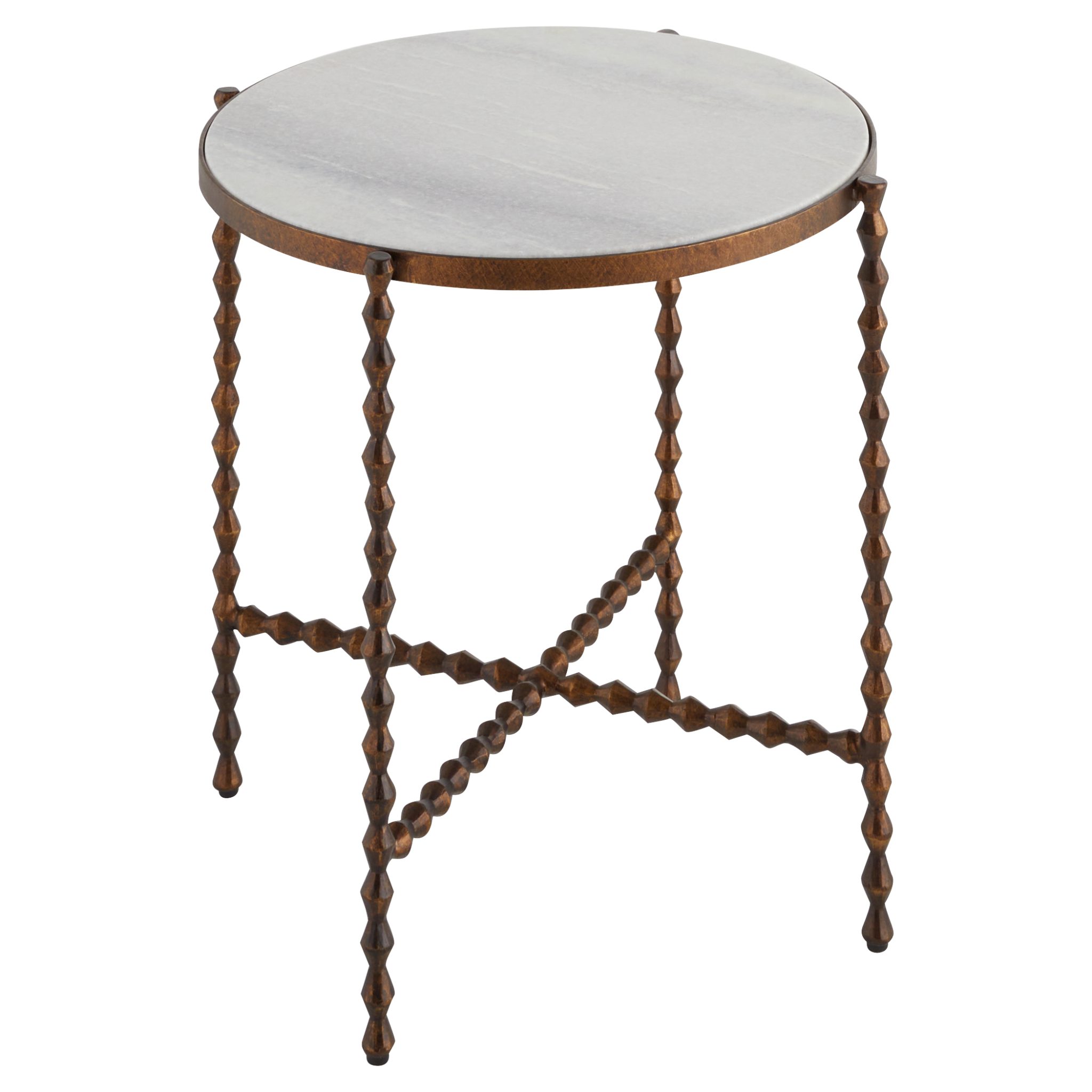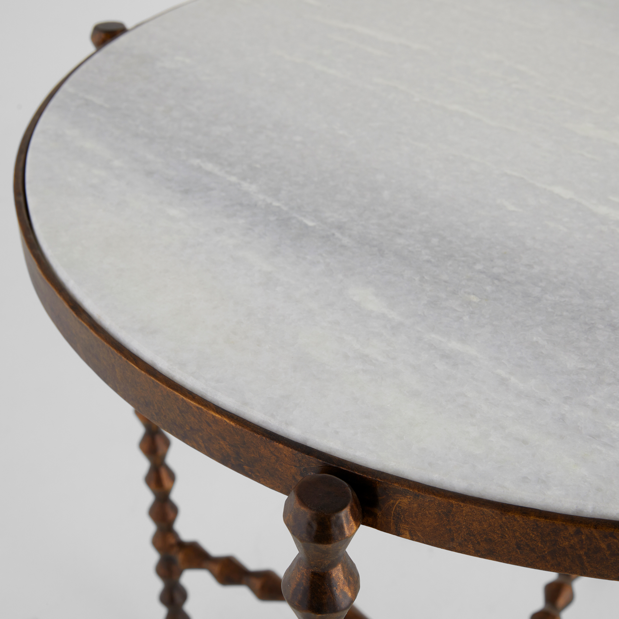 The Diamante features a hand-carved iron rod frame with a repeating conical diamond pattern finished in antique bronze. Sourced from Rajasthan, India, this natural white marble tabletop is highly durable with minimal water absorption, making it a perfect side table for beverages.