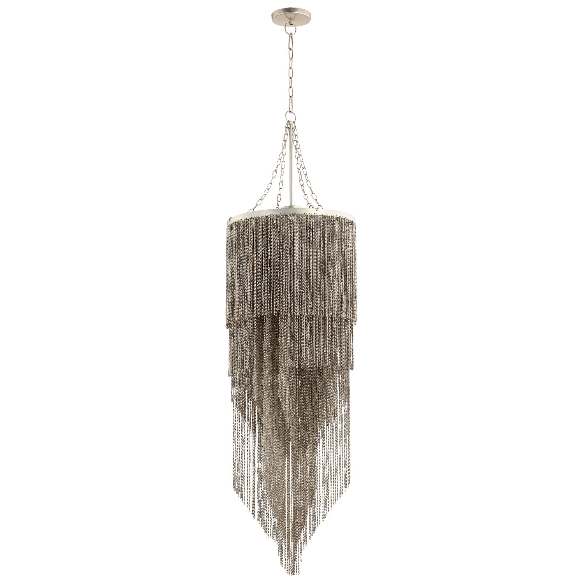 With its commanding silhouette, the silver Divaza chandelier will prove a worthy centerpiece in any elegant abode. This stunning fixture offers a streamlined take on the captivating crystal chandeliers of living rooms past. Beautifully draped strands of chains layer to form a stunning, tiered exterior shroud on this sophisticated light pendant. Resembling the elegance of a formal dress this luxurious luminary will surely anchor the look of your space.