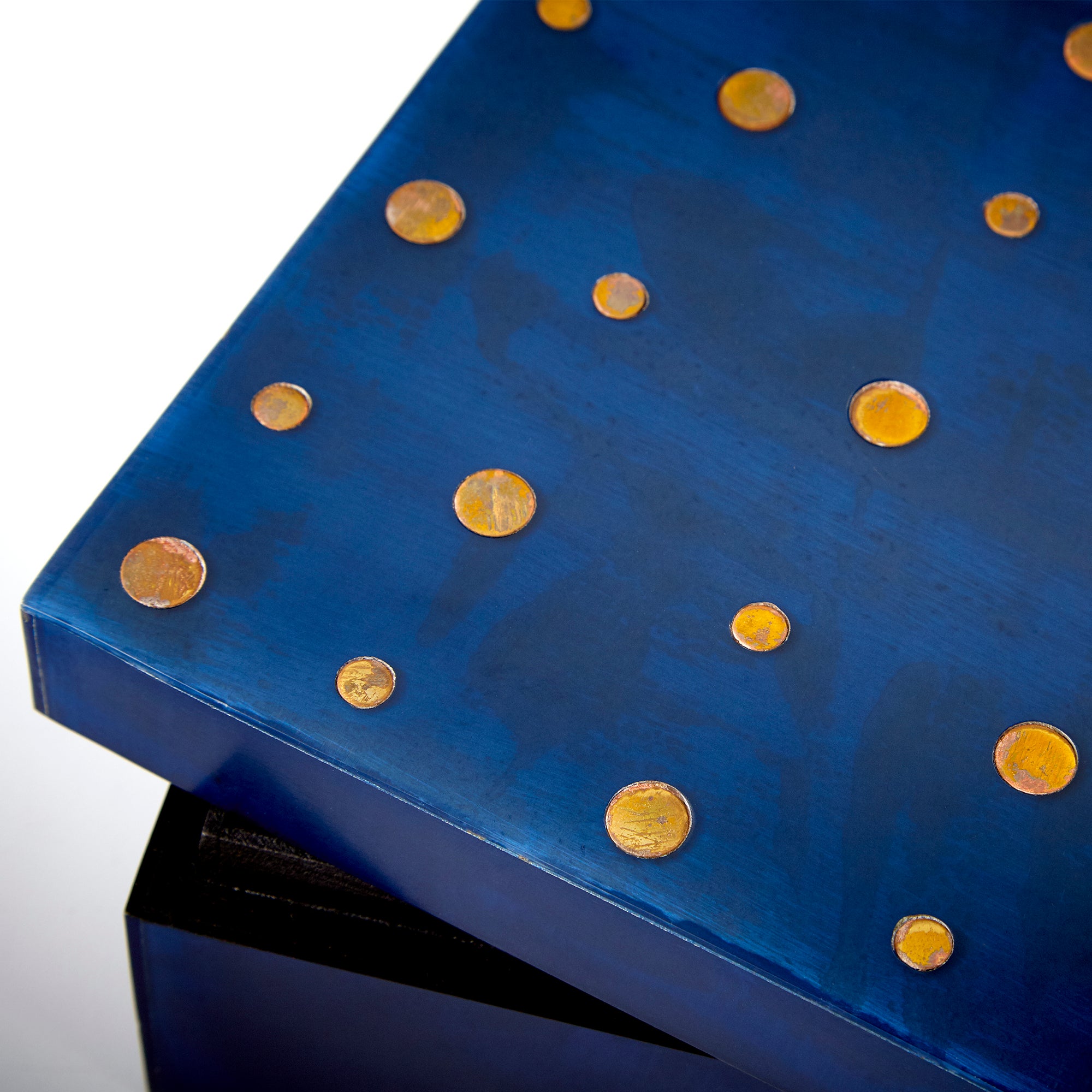 Deep black and brass finish sets a dramatic focal point on a master bedroom dresser. This large wooden treasure box is perfect for holding love letters or beloved jewelry.