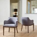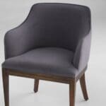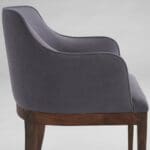 The Dublin chair’s structure and seat are crafted from solid Grandis wood reinforced by multi-laminated sheet metal. The solid curved backrest offers comfort and support with D26 foam upholstered in a medium grey velour fabric, ensuring a cozy seating experience. Its front legs, straight and tapered, lend a touch of contemporary design, while the back legs are gracefully curved in a traditional saber style.