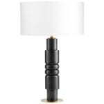 Designed for Cyan Design by J. Kent Martin. Add the finishing touch to any design plan, commercial or residential with the elegant, Dubois table lamp. Balanced perfectly atop a flat rounded, brass base sits a solid piece of intricately carved marble, designed with ribbed accents in the center, flanked by two thin sections at both the top and bottom compartments, all coated in a moody black finish. Topped with a linen hardback drum shade and paired with a matching brass finial and harp. All this combined makes the Dubois lamp the perfect choice for any upscale bedroom, transitional entryway, or mid-century modern living room ensemble.