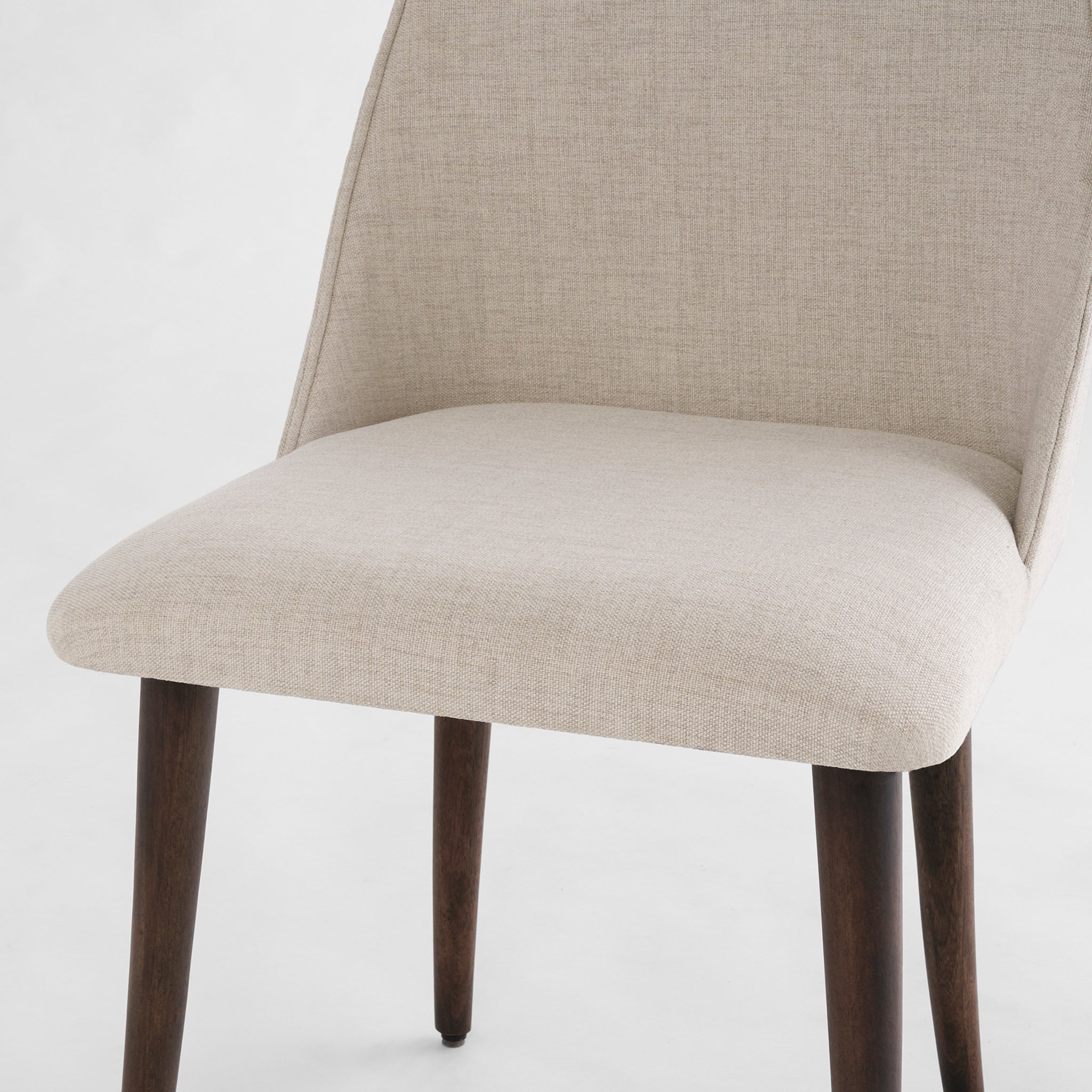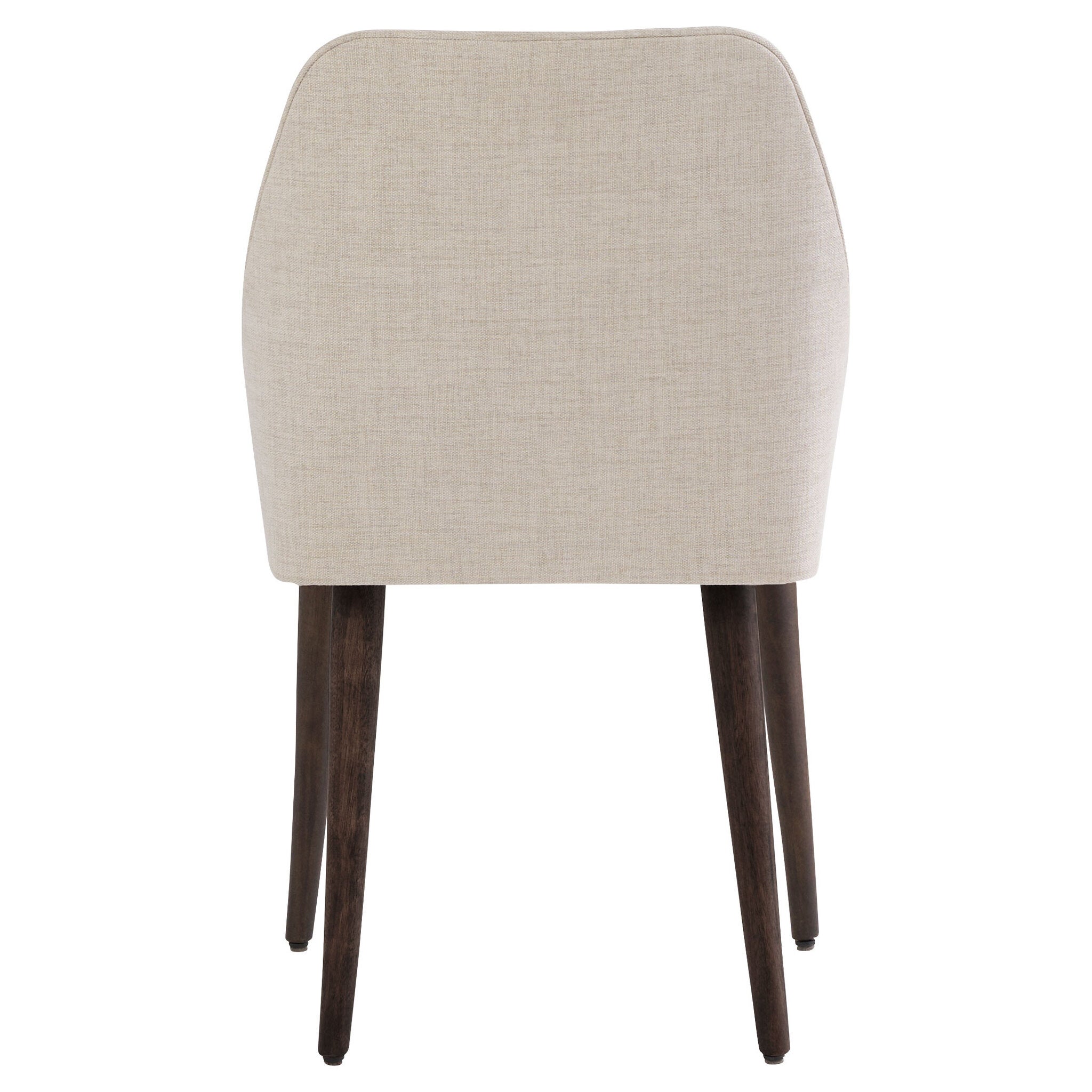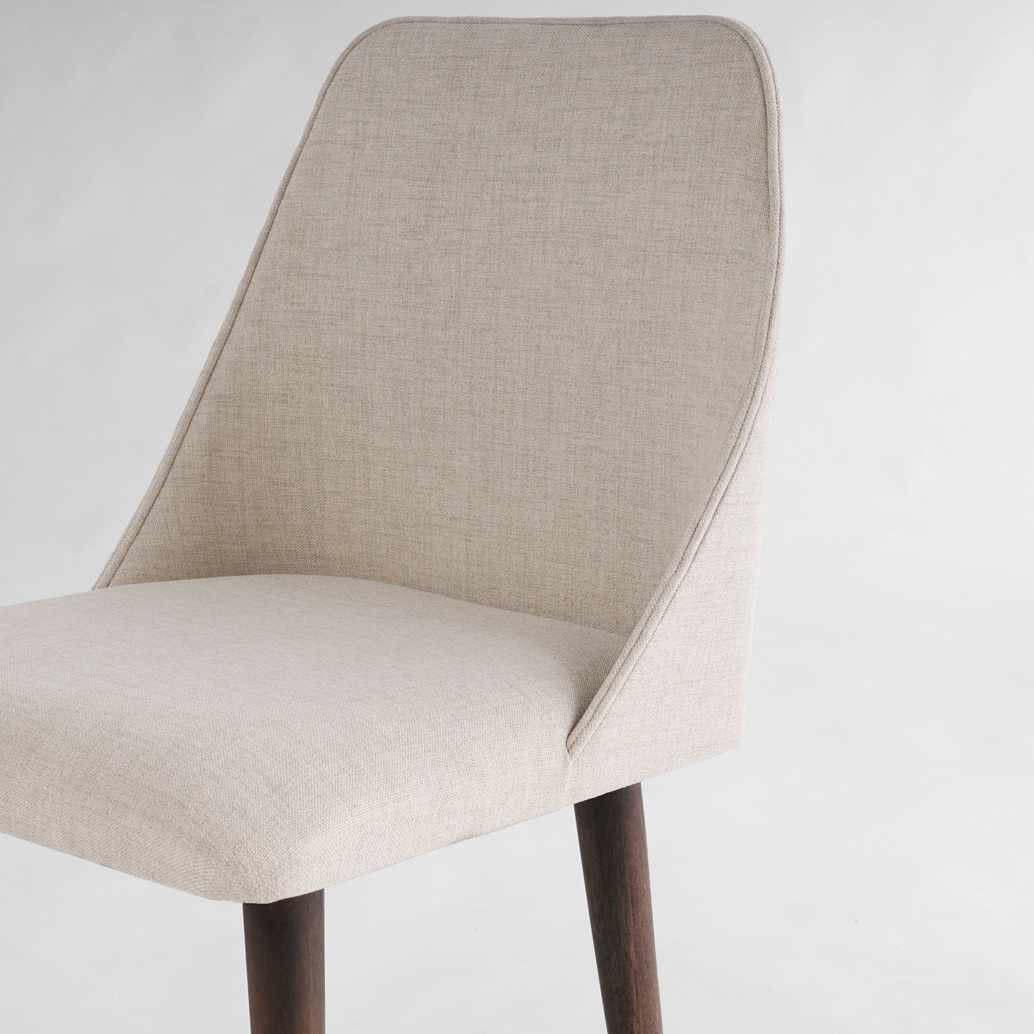 The Edu chair’s structure and seat are crafted from solid Grandis wood reinforced by multi-laminated sheet metal. The solid curved backrest offers comfort and support with D26 foam upholstered in a taupe tight weave, backed polyester fabric, ensuring a cozy seating experience. Its straight tapered legs are dark brown Grandis wood.