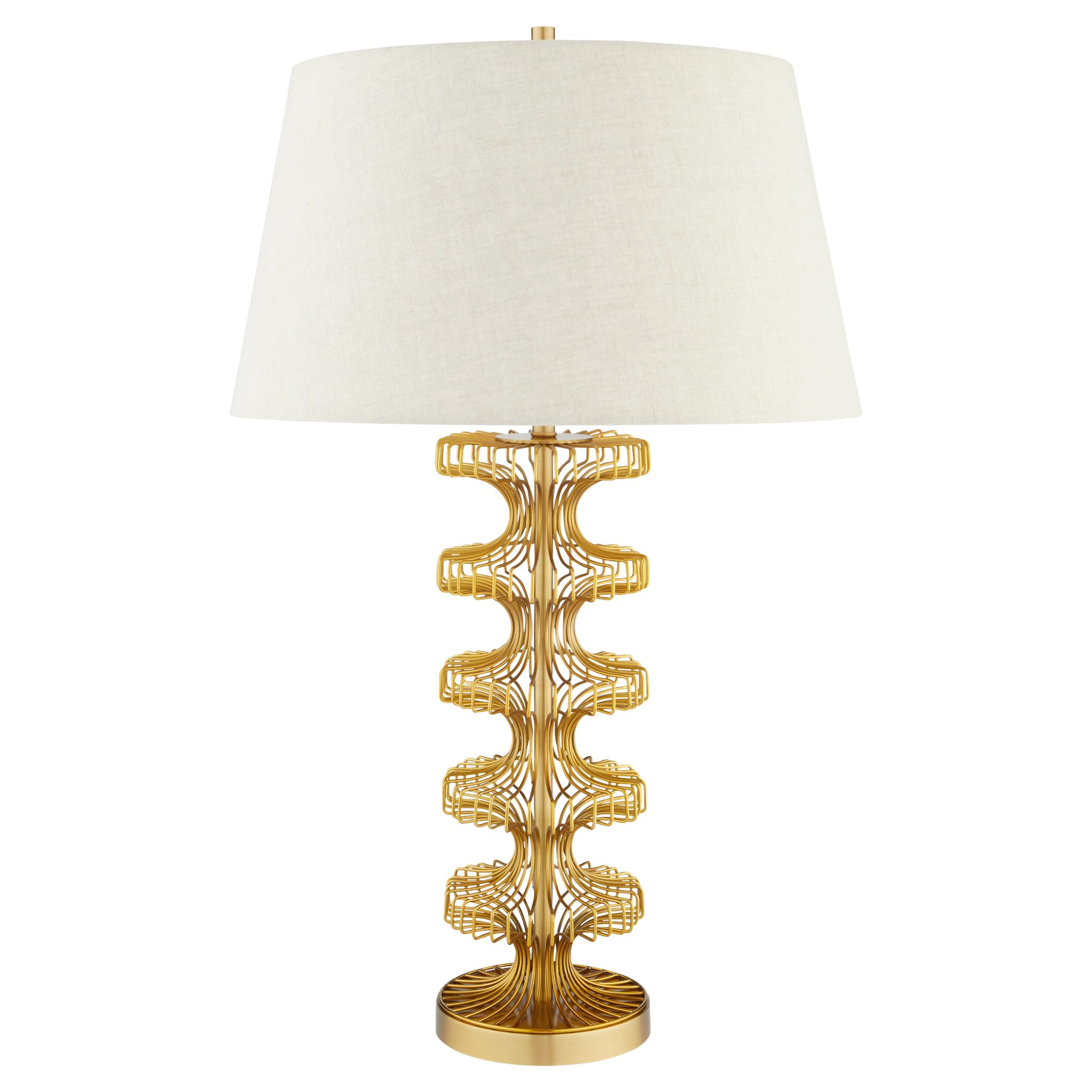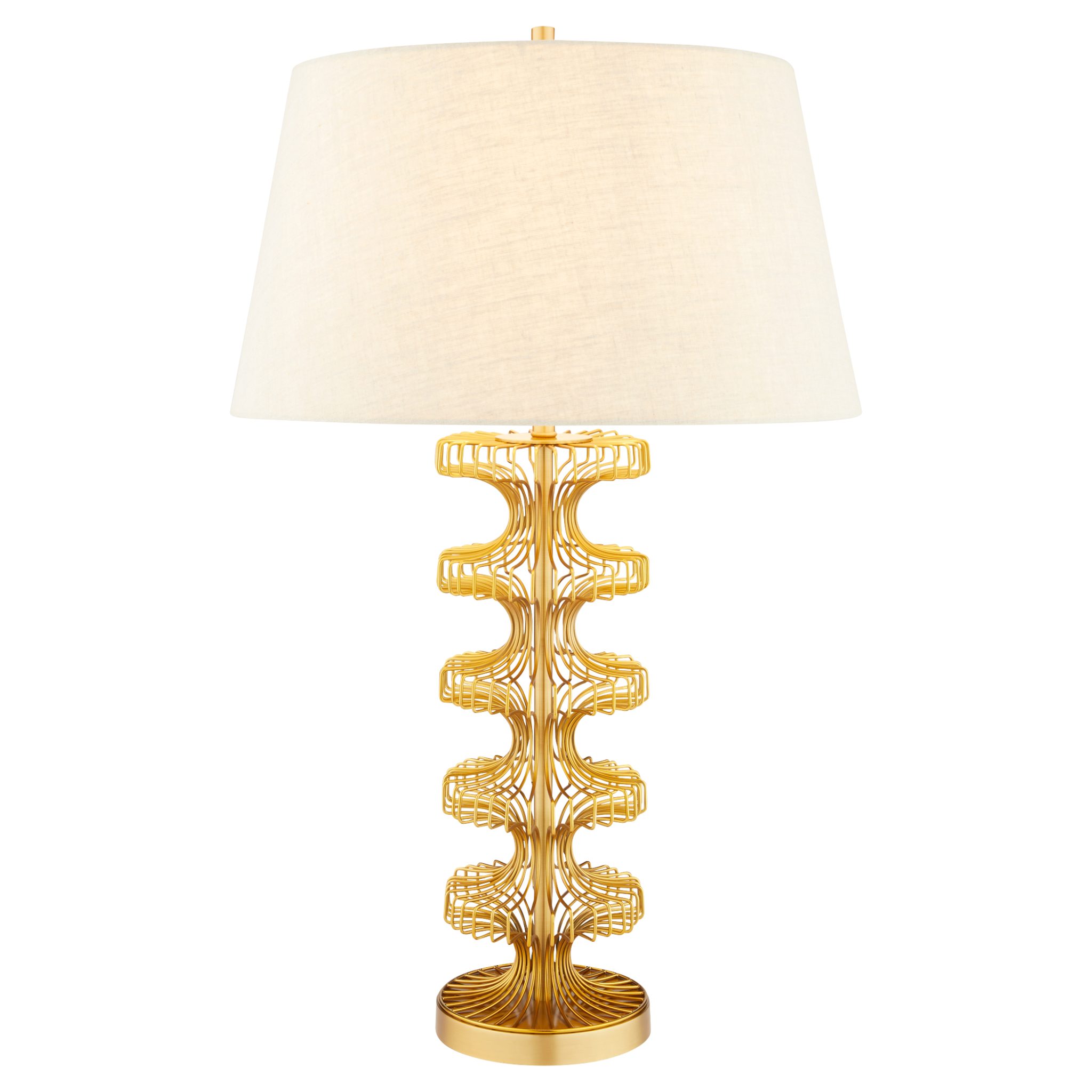 The Eero Table Lamp draws inspiration from Finnish-American architect Eero Saarinen’s design principles. Featuring meticulously bent wire in antique brass, each of the 32 continuous pieces forms a sleek, cylindrical lamp base. Topped with a taupe linen shade, this lamp exudes modern elegance and craftsmanship.