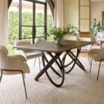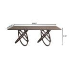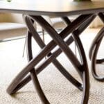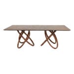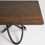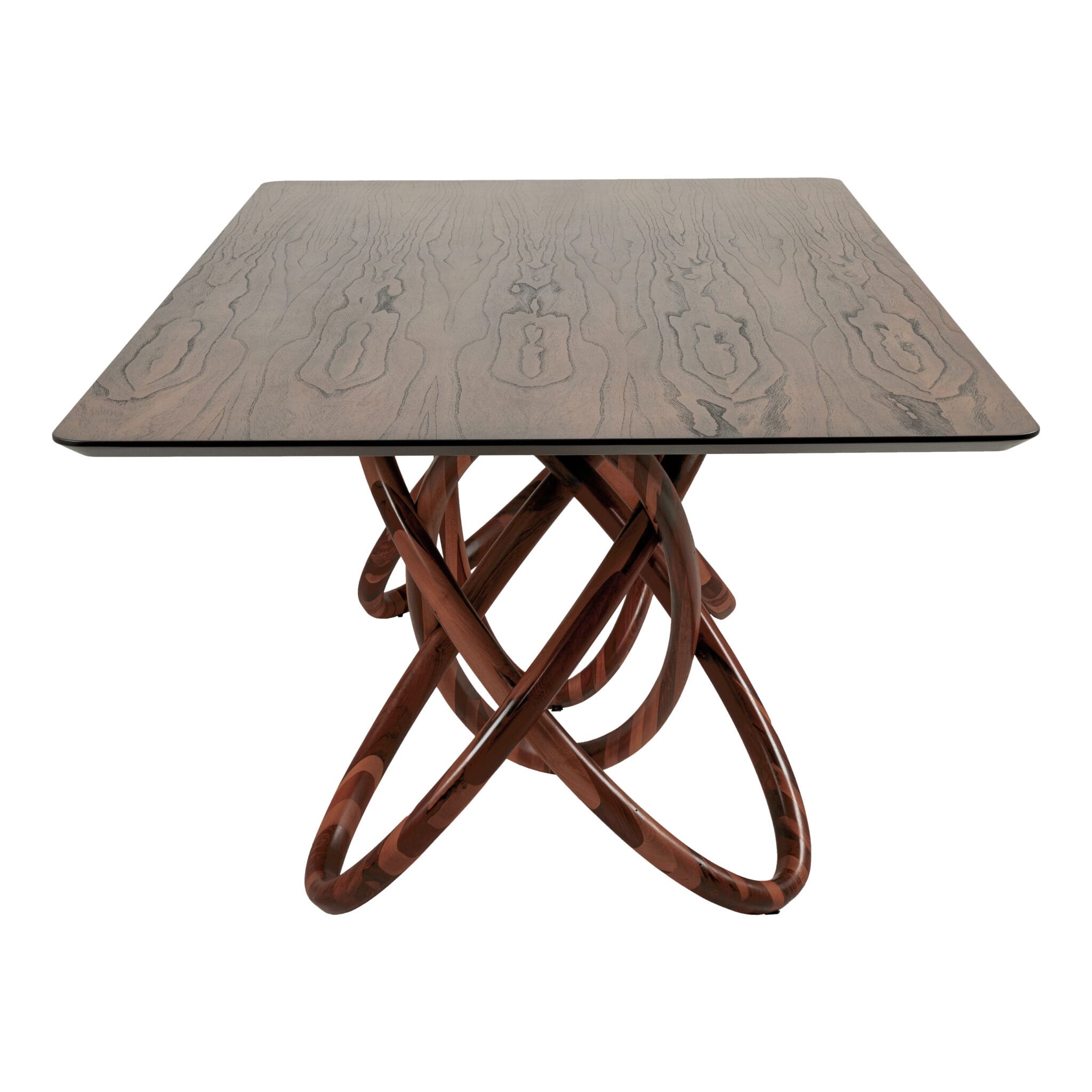 The Elo Dining Table features a solid dark Guajuvira wood base with shadowy variations shown in interwoven links that create a captivating effect. The table top is adorned with Hovenia wood veneer and a reverse chamfered edge.