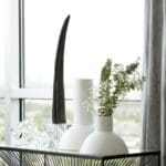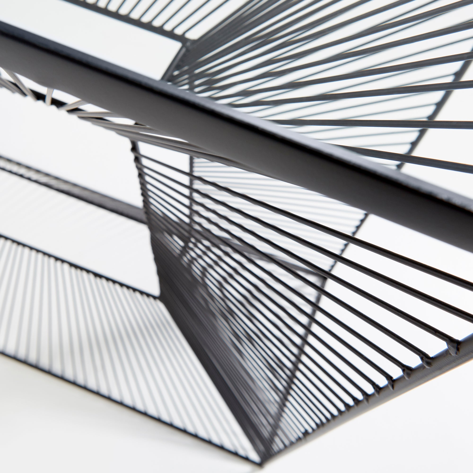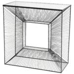 Bring a sleek and contemporary edge to your ensemble with this minimalist-inspired home furnishing. The Enchantment console table boasts modern appeal with its perfectly symmetrical wire metal frame. Within the box-shaped base, thin iron wires converge on the inner portion of the table to form a smaller box within a box. A clear, rectangular glass surface top sits perched atop the base to complete this trendsetting look.