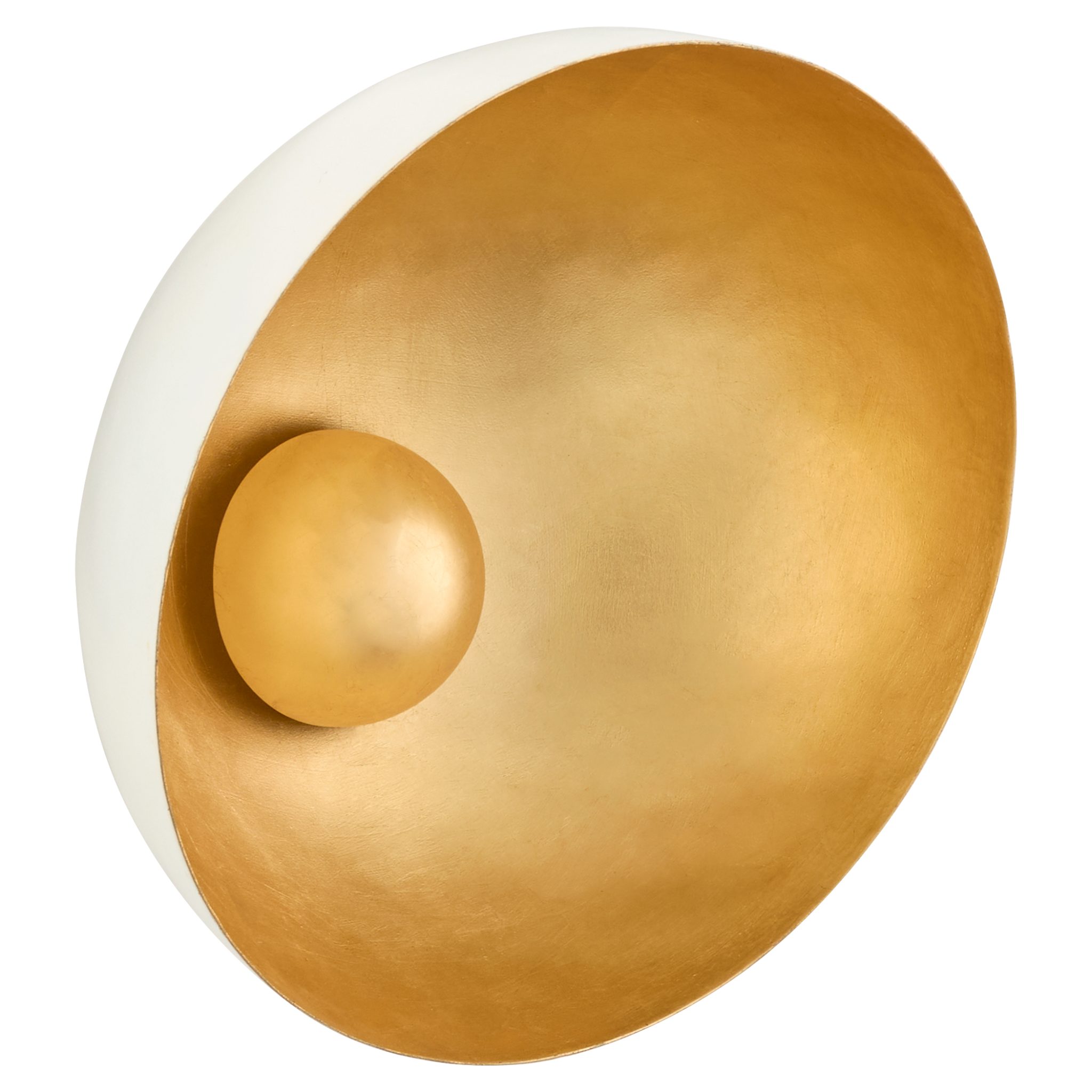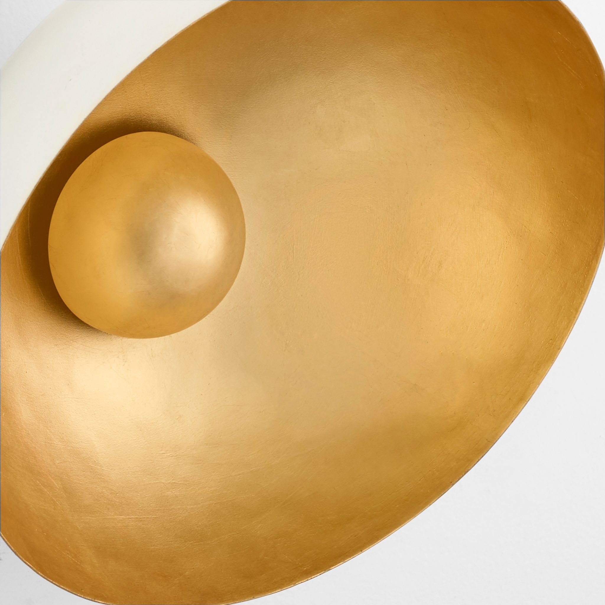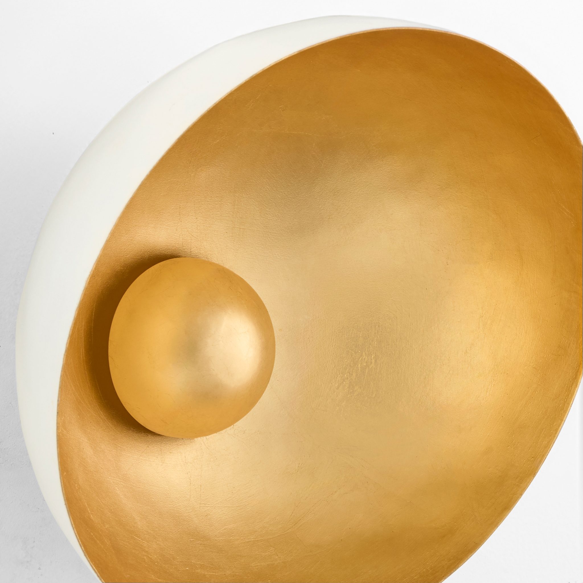 The Esfera Wall Art brings depth and dimension with its semi-spherical bowl shapes. A matte white exterior contrasts with a concave gold interior, while an asymmetrically mounted gold sphere adds visual intrigue. Available in three sizes, these pieces can be arranged to create a striking 3D wall display. Simple mounting hardware is included.