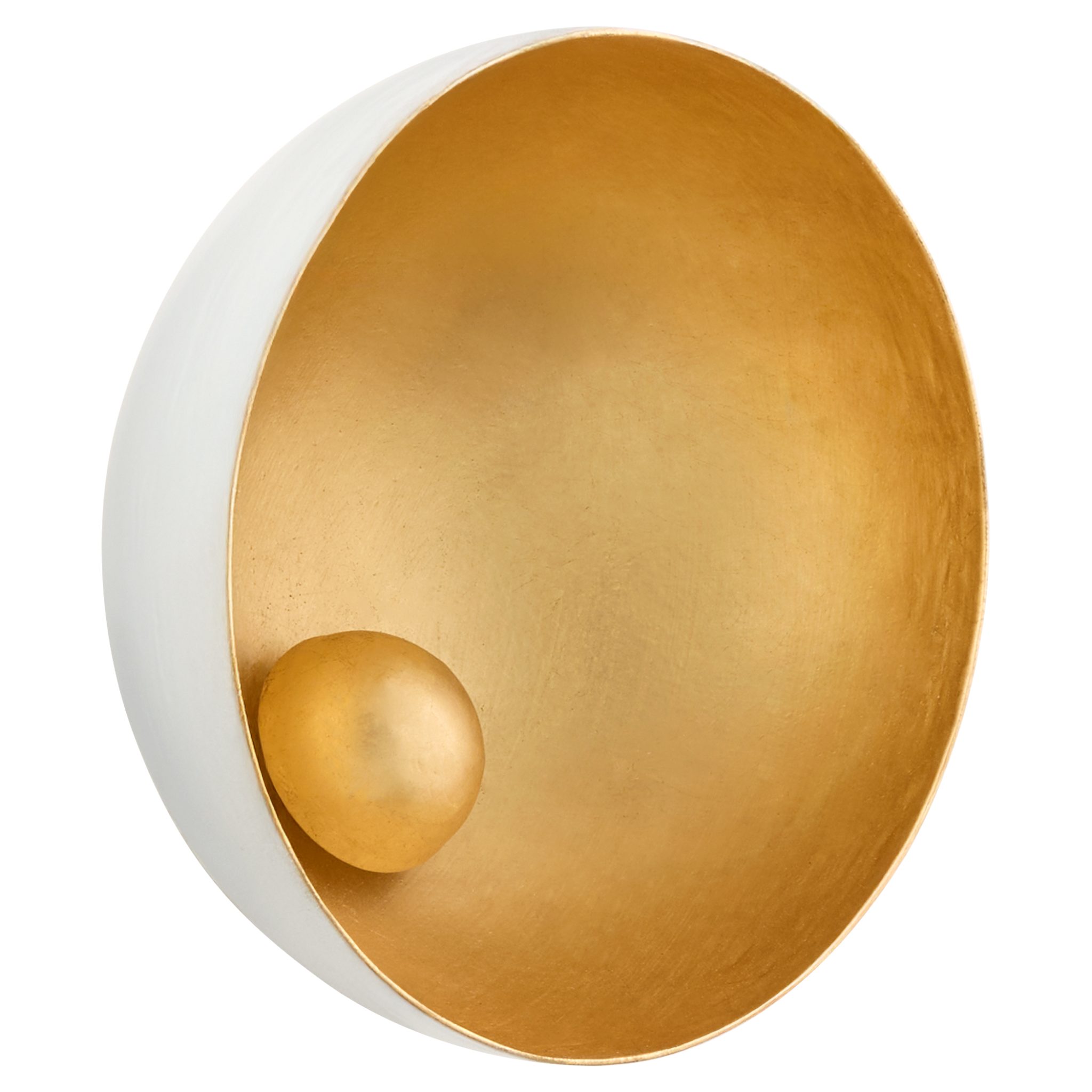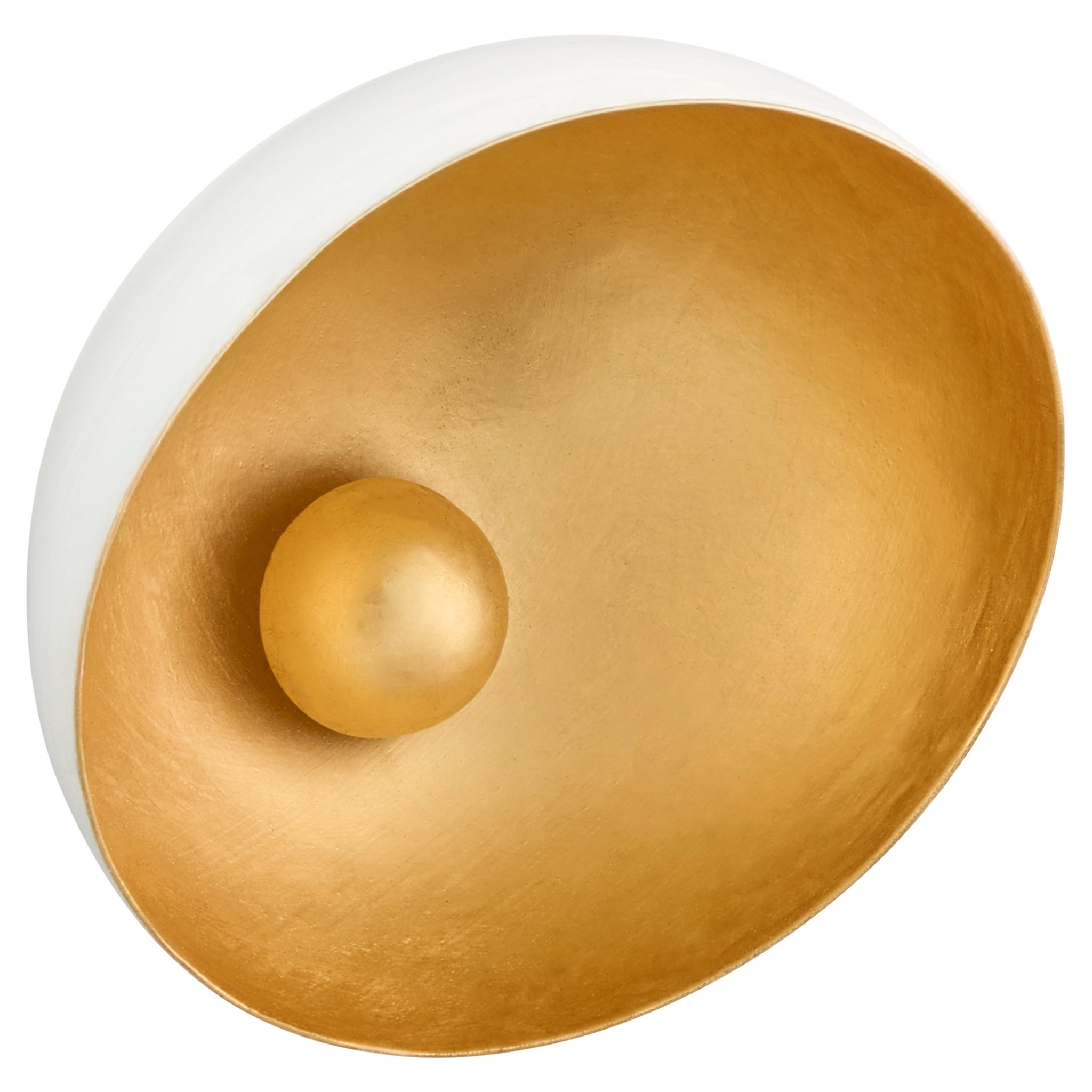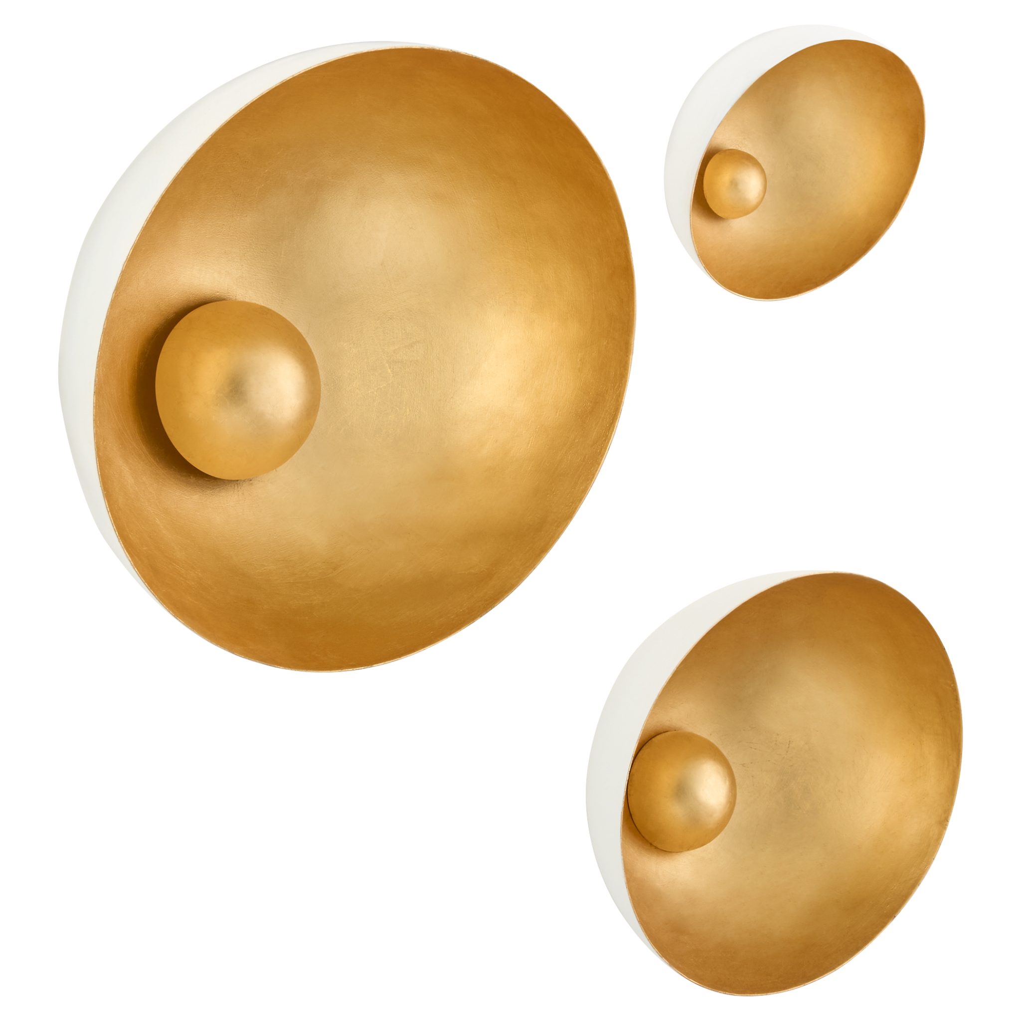 The Esfera Wall Art brings depth and dimension with its semi-spherical bowl shapes. A matte white exterior contrasts with a concave gold interior, while an asymmetrically mounted gold sphere adds visual intrigue. Available in three sizes, these pieces can be arranged to create a striking 3D wall display. Simple mounting hardware is included.