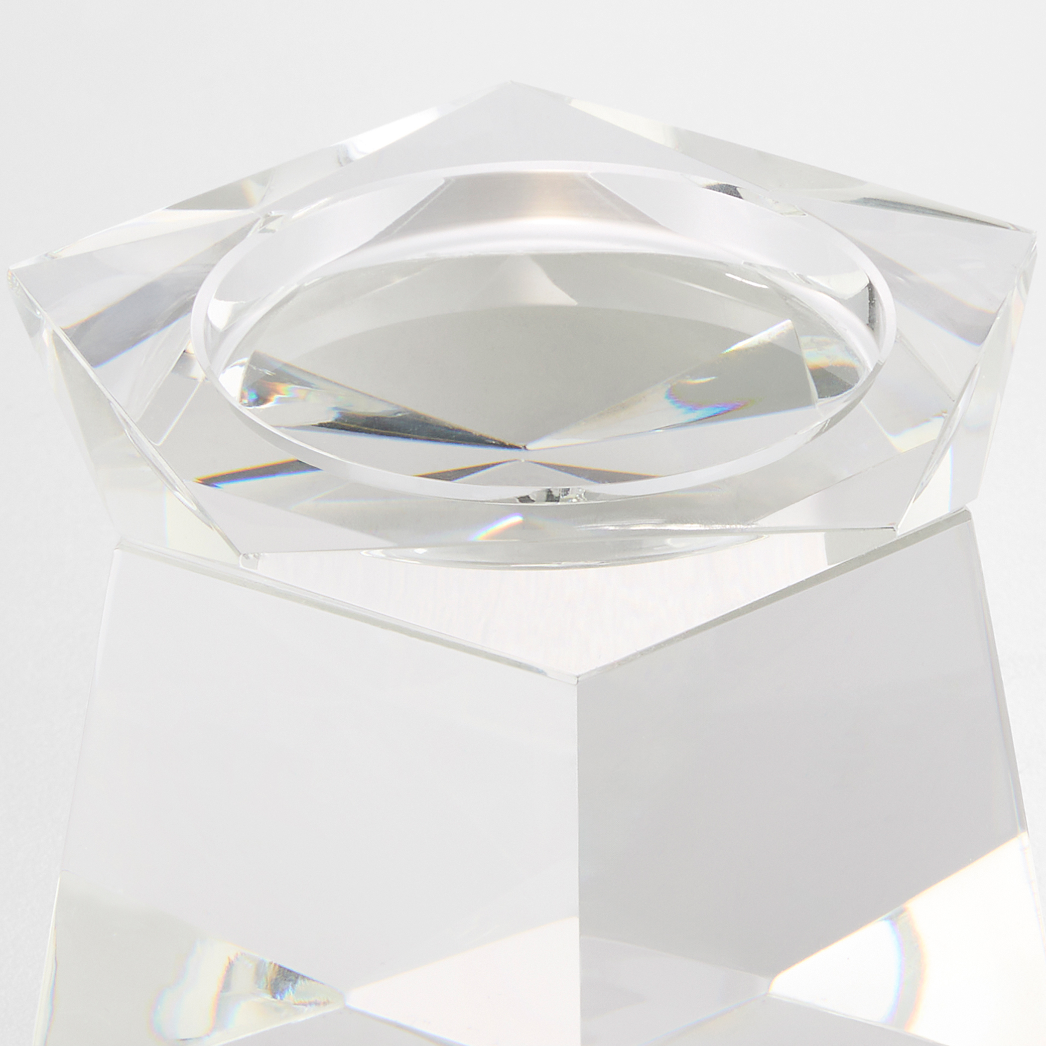 The Faceted Pillar Candleholders feature modern crystal with a bold scale and precise clarity. Its versatile design transitions effortlessly from formal to relaxed settings. Available in various shapes and sizes, it can be paired together for a bold presence or stand alone as an eye-catching accent.