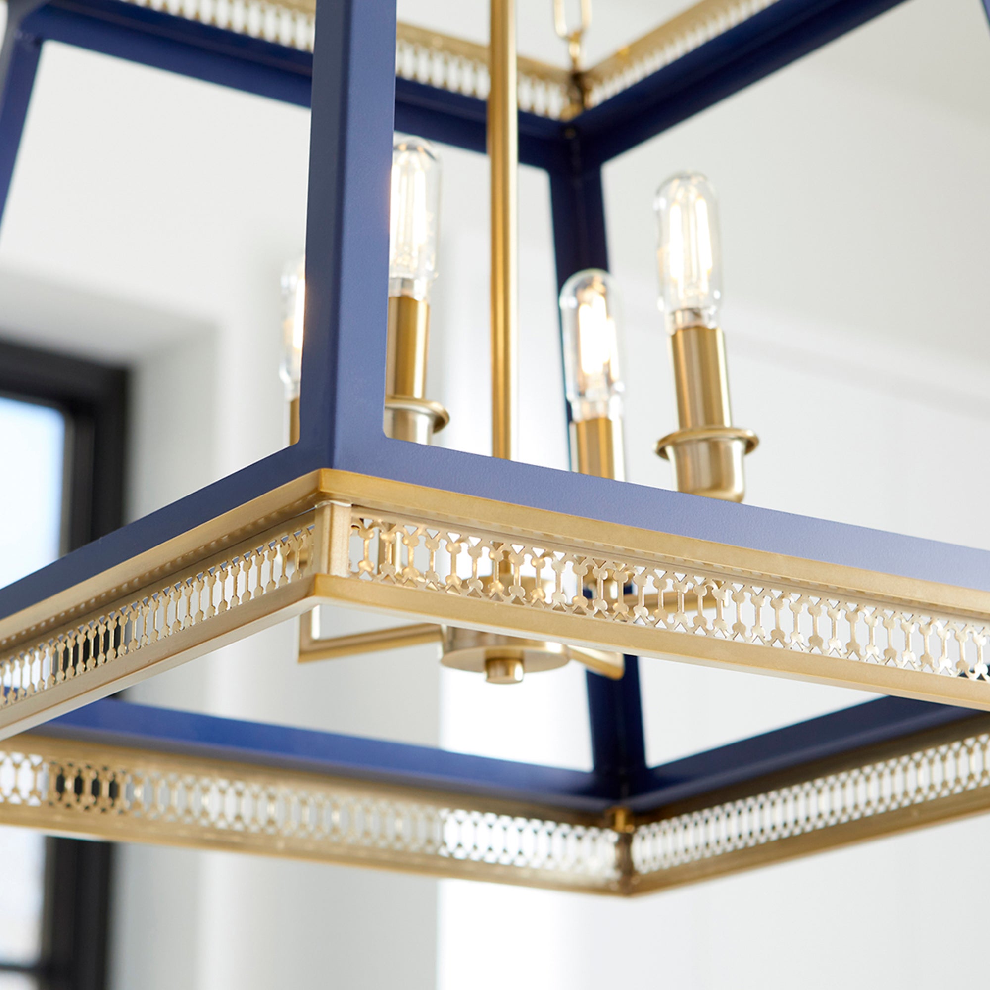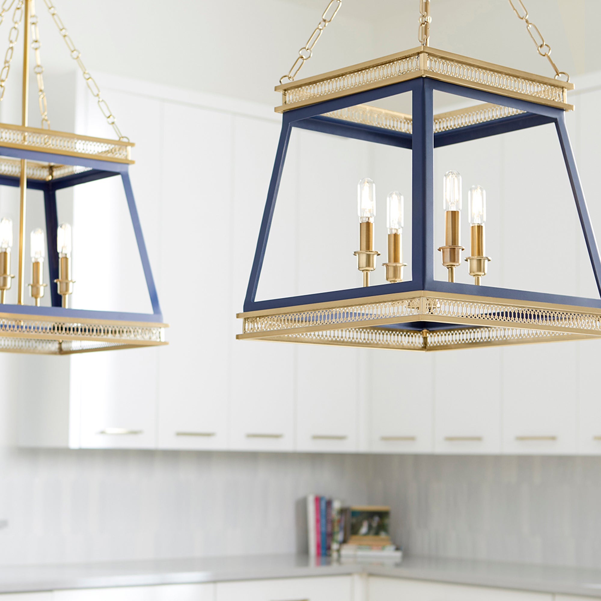 The charming four-light Gerard pendant draws inspiration from neo-nostalgic French country design. The two-tone, aged brass/blue fixture sports an open frame with four candelabra sockets nestled neatly within. The crown of the enclosed structure boasts ornate molding that attaches to the matching chain suspension system. This luminary is the perfect fixture to showcase in multiples over your traditional kitchen island, to line down your modern farmhouse hallway, or to hang over your cute and cozy reading nook. With ample illumination cast from the light source, the Gerard pendant delivers in its function as much as it does its beautiful form.