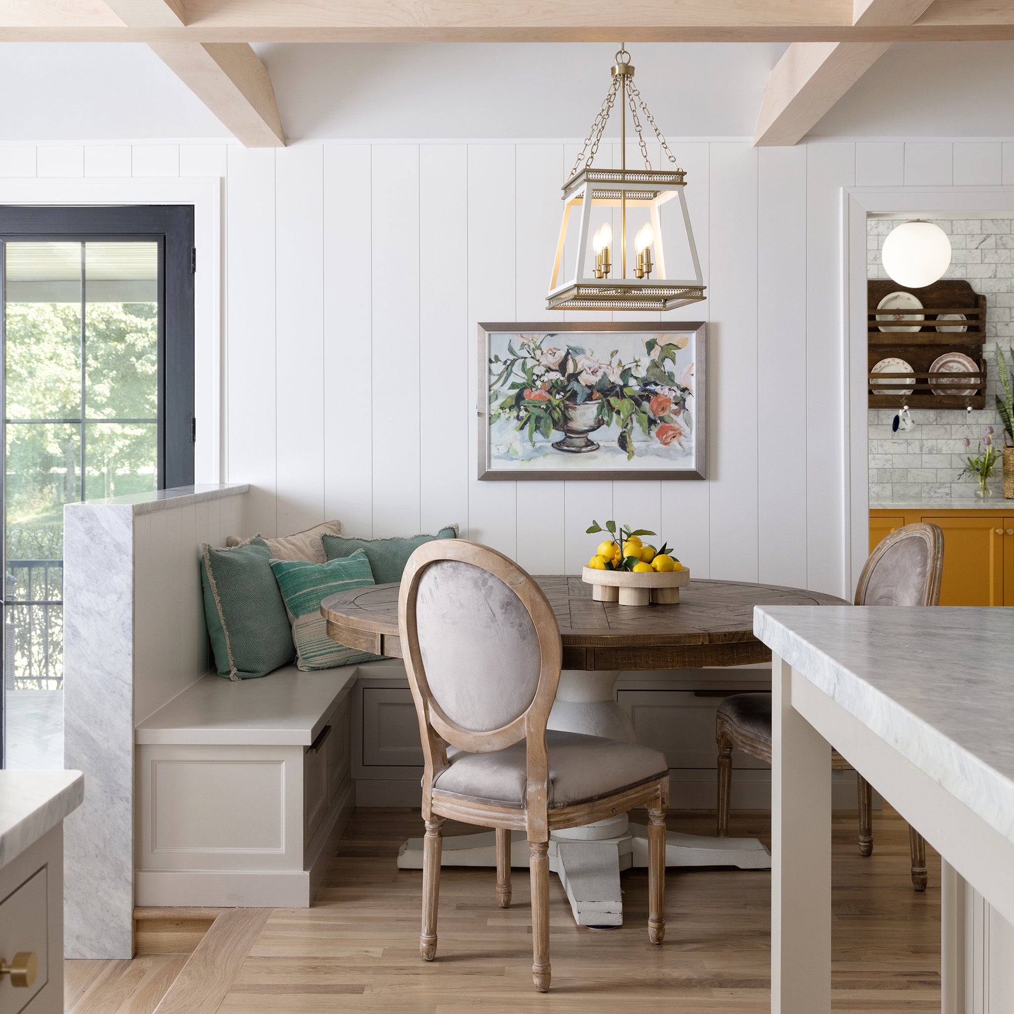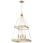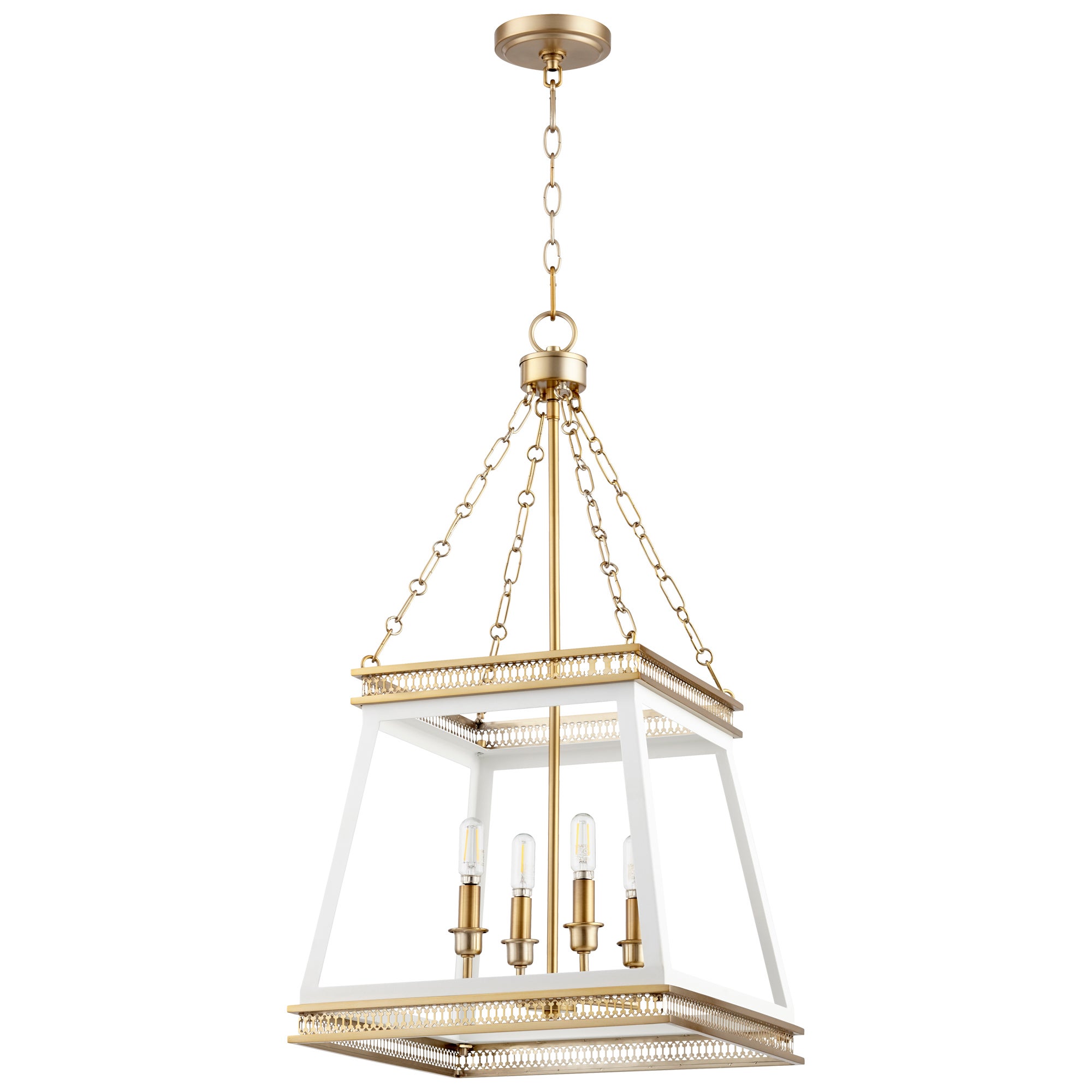 The charming four-light Gerard pendant draws inspiration from neo-nostalgic French country design. The two-tone, aged brass/white fixture sports an open frame with four candelabra sockets nestled neatly within. The crown of the enclosed structure boasts ornate molding that attaches to the matching chain suspension system. This luminary is the perfect fixture to showcase in multiples over your traditional kitchen island, to line down your modern farmhouse hallway, or to hang over your cute and cozy reading nook. With ample illumination cast from the light source, the Gerard pendant delivers in its function as much as it does its beautiful form.