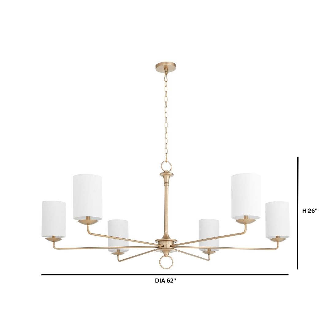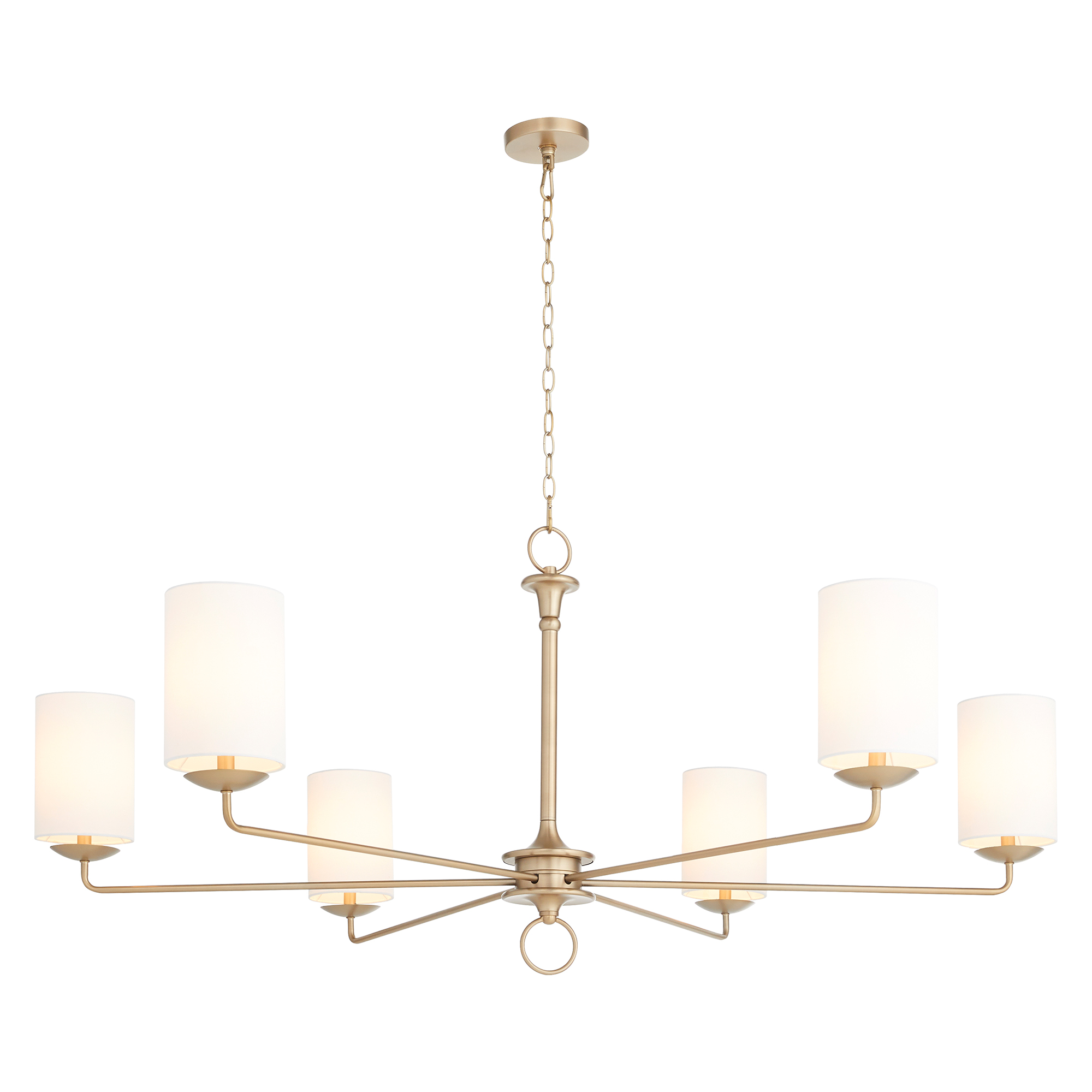 The Ginevra chandelier makes a powerful impact with its oversized spider-like silhouette. Six 60w candelabra lights are cloaked by smooth, white fabric cylindrical shades. Ring details on the aged brass frame support the overall composition by adding a layer of subtle style. An 8-foot rectangle link chain and damp-listing provide placement flexibility. Available in two sizes.