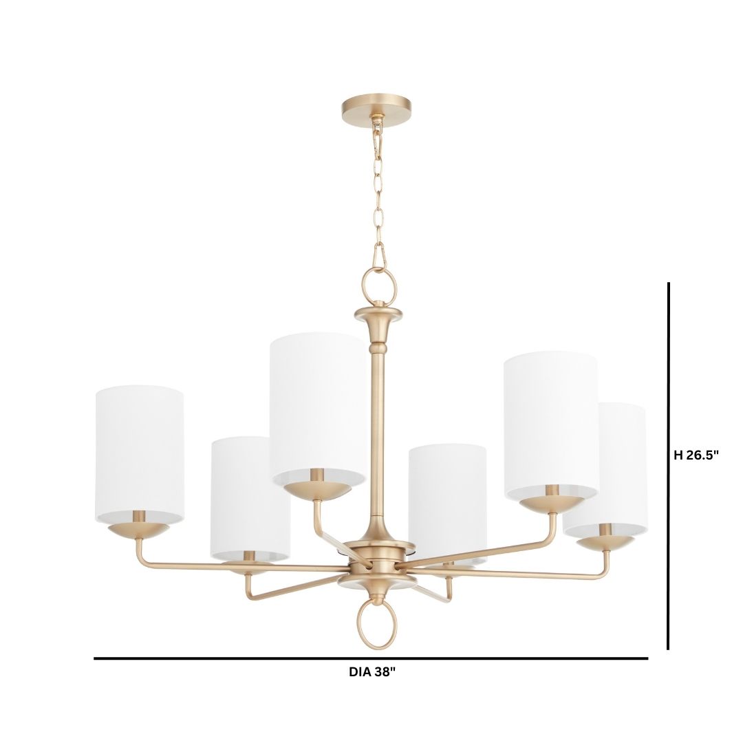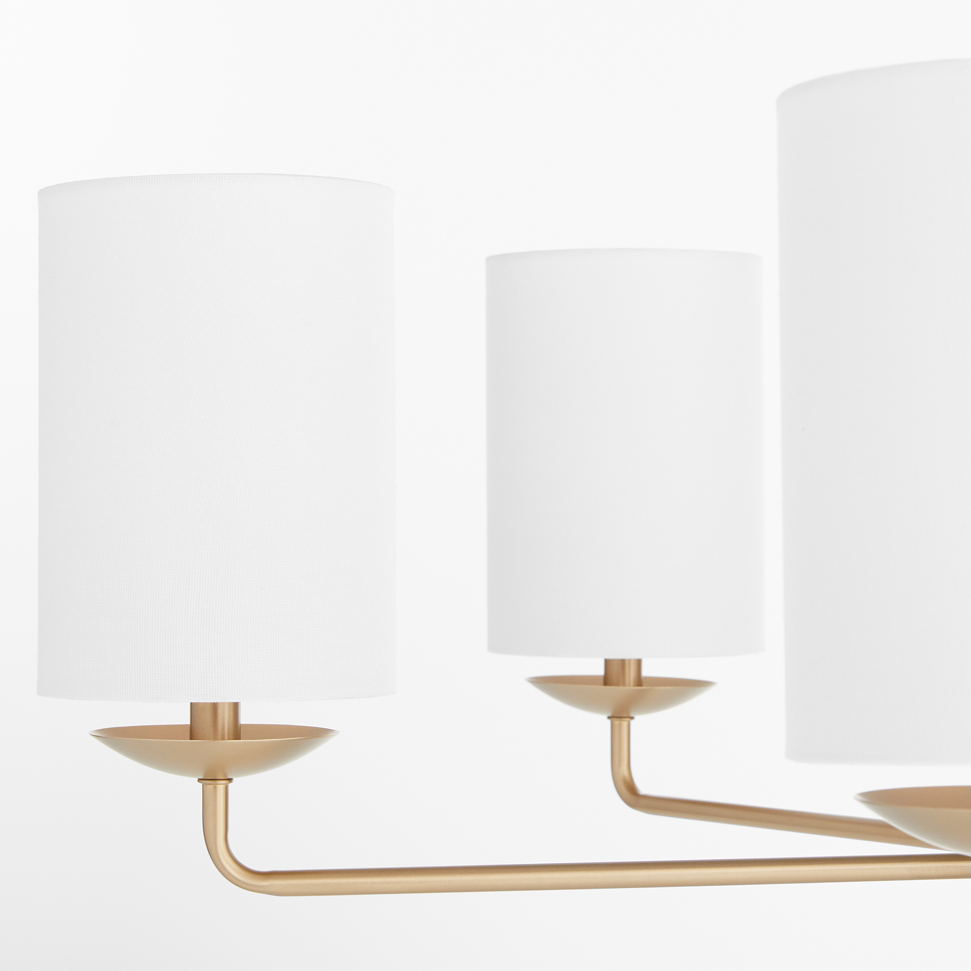 The Ginevra chandelier makes a powerful impact with its oversized spider-like silhouette. Six 60w candelabra lights are cloaked by smooth, white fabric cylindrical shades. Ring details on the aged brass frame support the overall composition by adding a layer of subtle style. An 8-foot rectangle link chain and damp-listing provide placement flexibility. Available in two sizes.