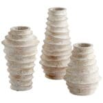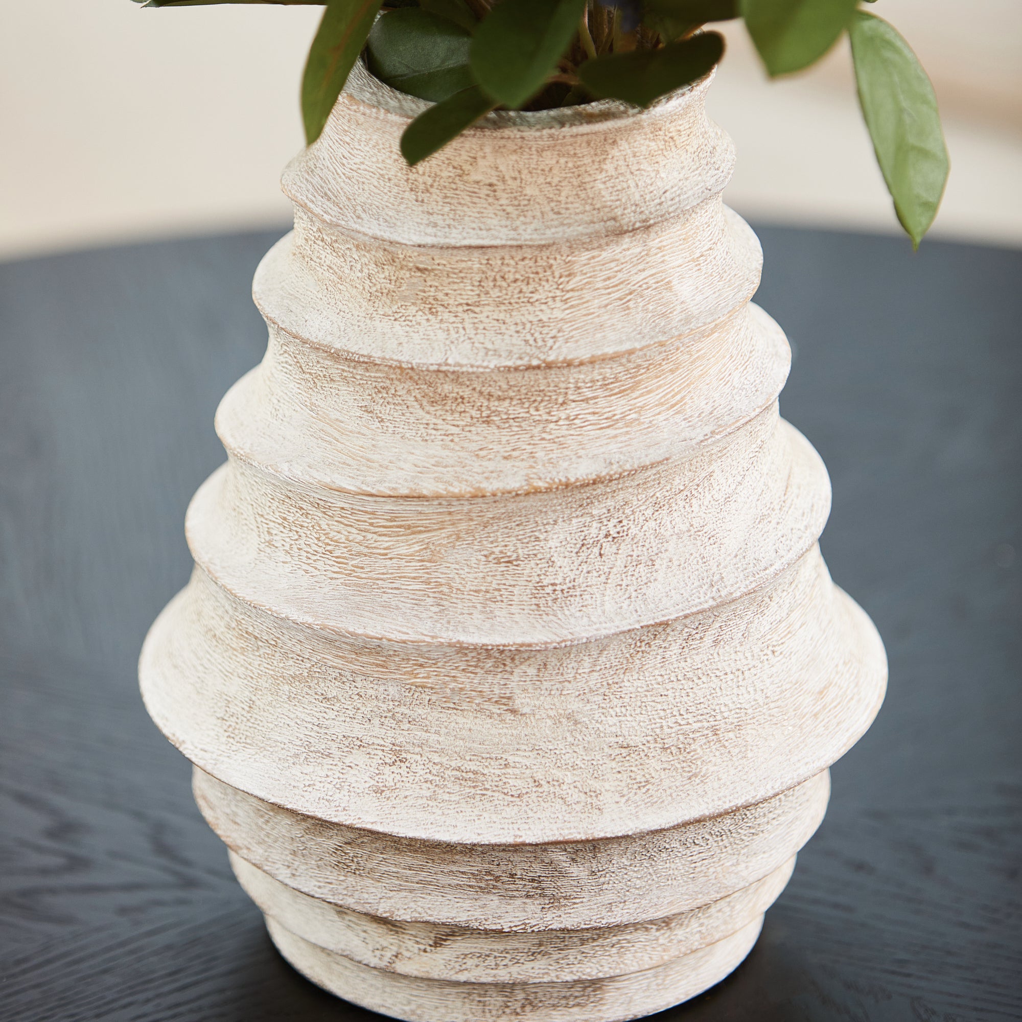 Featuring distinctive whitewashed cream tones, this collection of cylindrical vases will add class and charm to any ensemble. Available in three different sizes these wooden vases offer dynamic looks thanks to the textured beige tones. Serving as unique vessels for all of your floral storage needs, these rustic, ribbed table vases will look great in any farmhouse, boho, or shabby-chic setting.