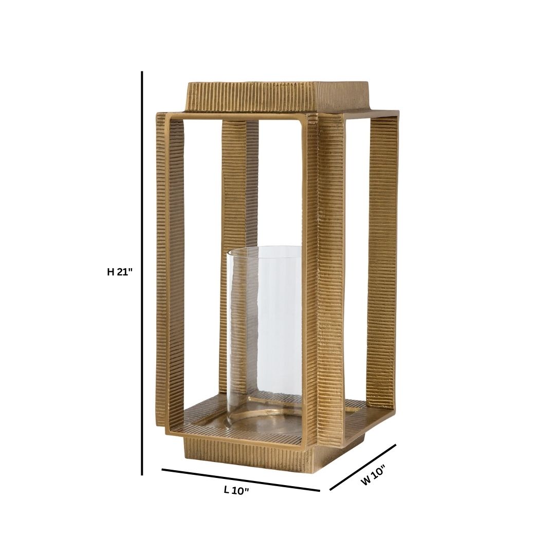 Crafted from durable cast aluminum with a raked texture and glass, the Graycliff lanterns were inspired by the allure of window frames and feature four framed openings that exude architectural sophistication. The square footprint, elevated on a raised platform, comes complete with a clear glass inset cylinder, perfectly sized to hold a three-inch pillar candle. A subtle indentation in the base cradles the clear glass cylinder, enhancing the lantern’s visual appeal while providing a secure placement for the candle. Create an enchanting ambiance with aged brass that captivates guests and transforms your space into a picturesque retreat. Available in two sizes.