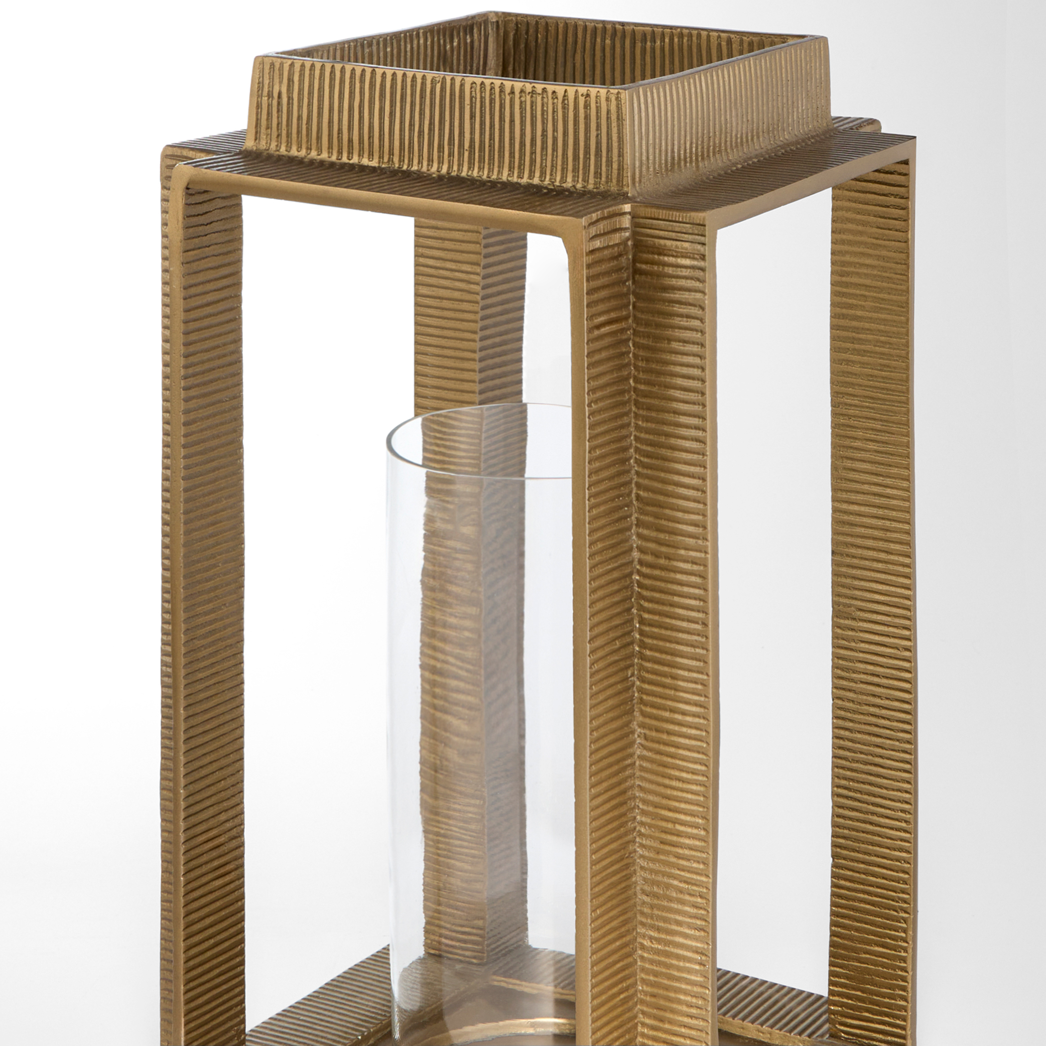 Crafted from durable cast aluminum with a raked texture and glass, the Graycliff lanterns were inspired by the allure of window frames and feature four framed openings that exude architectural sophistication. The square footprint, elevated on a raised platform, comes complete with a clear glass inset cylinder, perfectly sized to hold a three-inch pillar candle. A subtle indentation in the base cradles the clear glass cylinder, enhancing the lantern’s visual appeal while providing a secure placement for the candle. Create an enchanting ambiance with aged brass that captivates guests and transforms your space into a picturesque retreat. Available in two sizes.