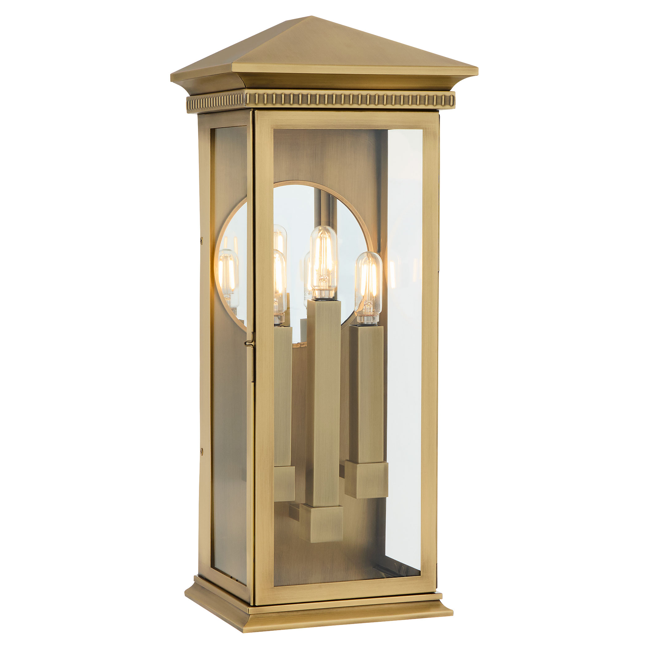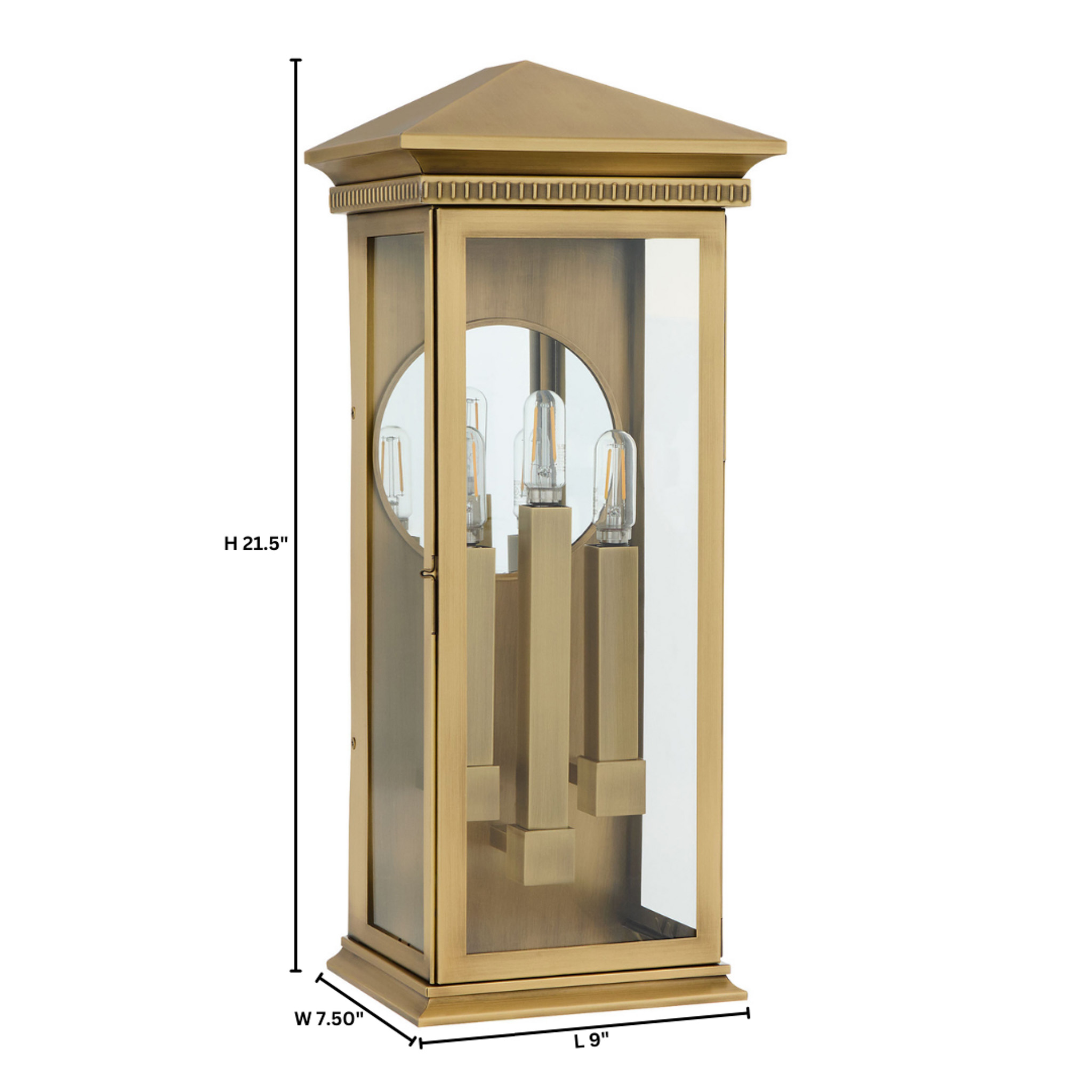 The Guilford outdoor wall mounts have a traditional lantern shape made of solid brass, giving the series an elegant and timeless appearance. Clear glass panels allow the light from candelabra sockets, which are accessible through a hinge-latch door. The lanterns are topped with a peaked roof and a decorative trim, adding to its refined glamor. Illuminate outdoor spaces such as entryways, porches, or patios while adding elegance and charm with the Guildford series of wall mounts.