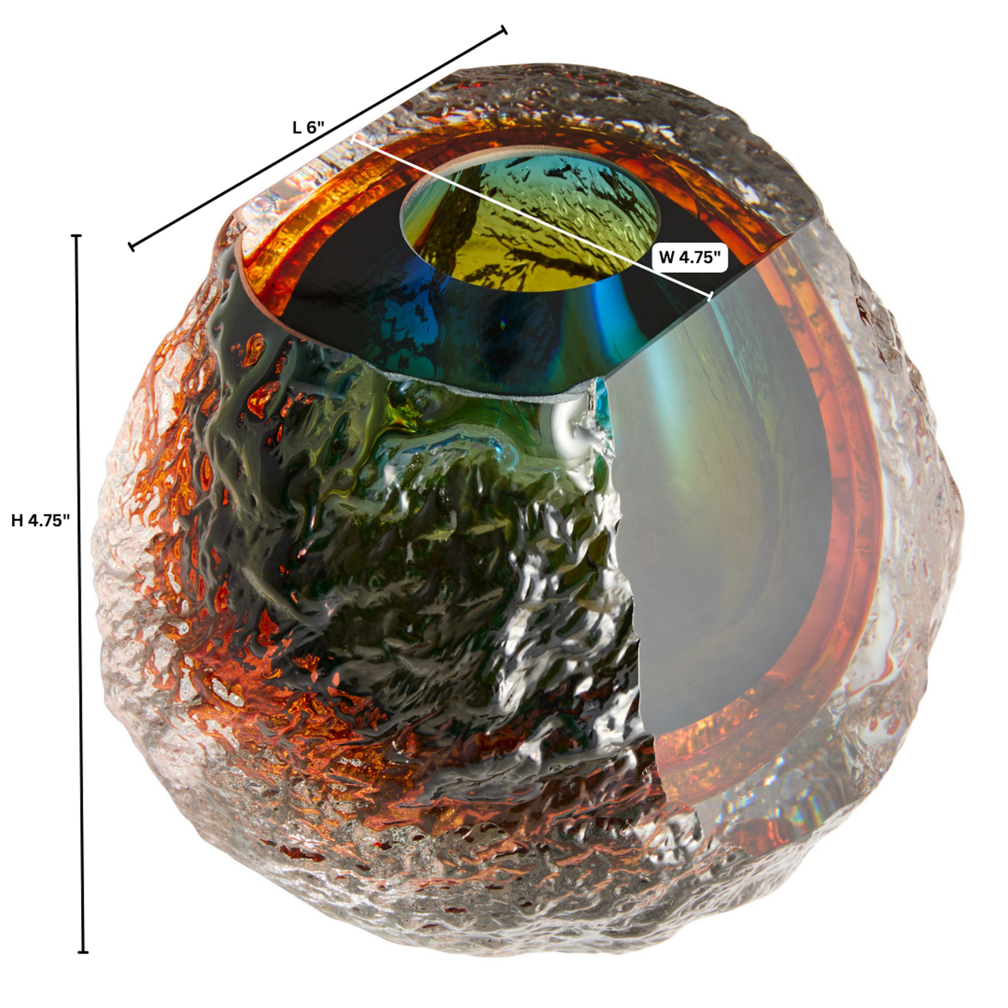 The Halley Vase, expertly handblown, showcases a captivating blend of blue, amber, and clear hues. Its striking color combination and intricate craftsmanship make it a perfect statement piece for adding depth and elegance to any decor.