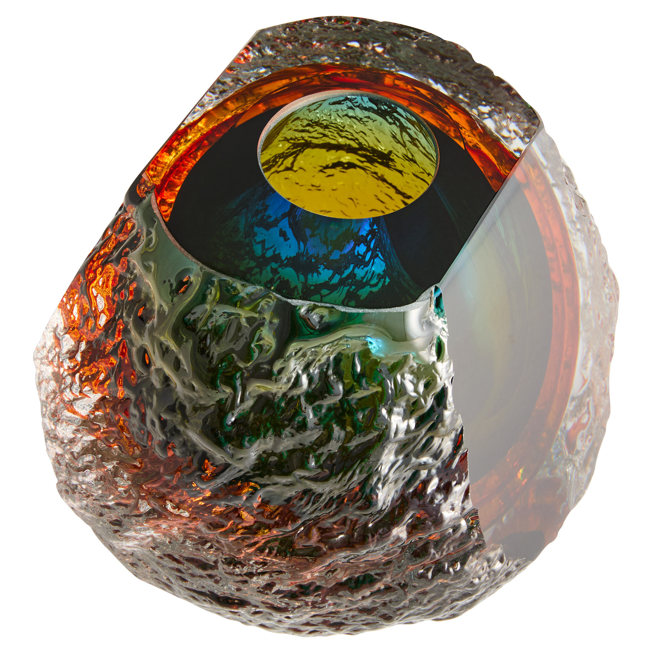 The Halley Vase, expertly handblown, showcases a captivating blend of blue, amber, and clear hues. Its striking color combination and intricate craftsmanship make it a perfect statement piece for adding depth and elegance to any decor.