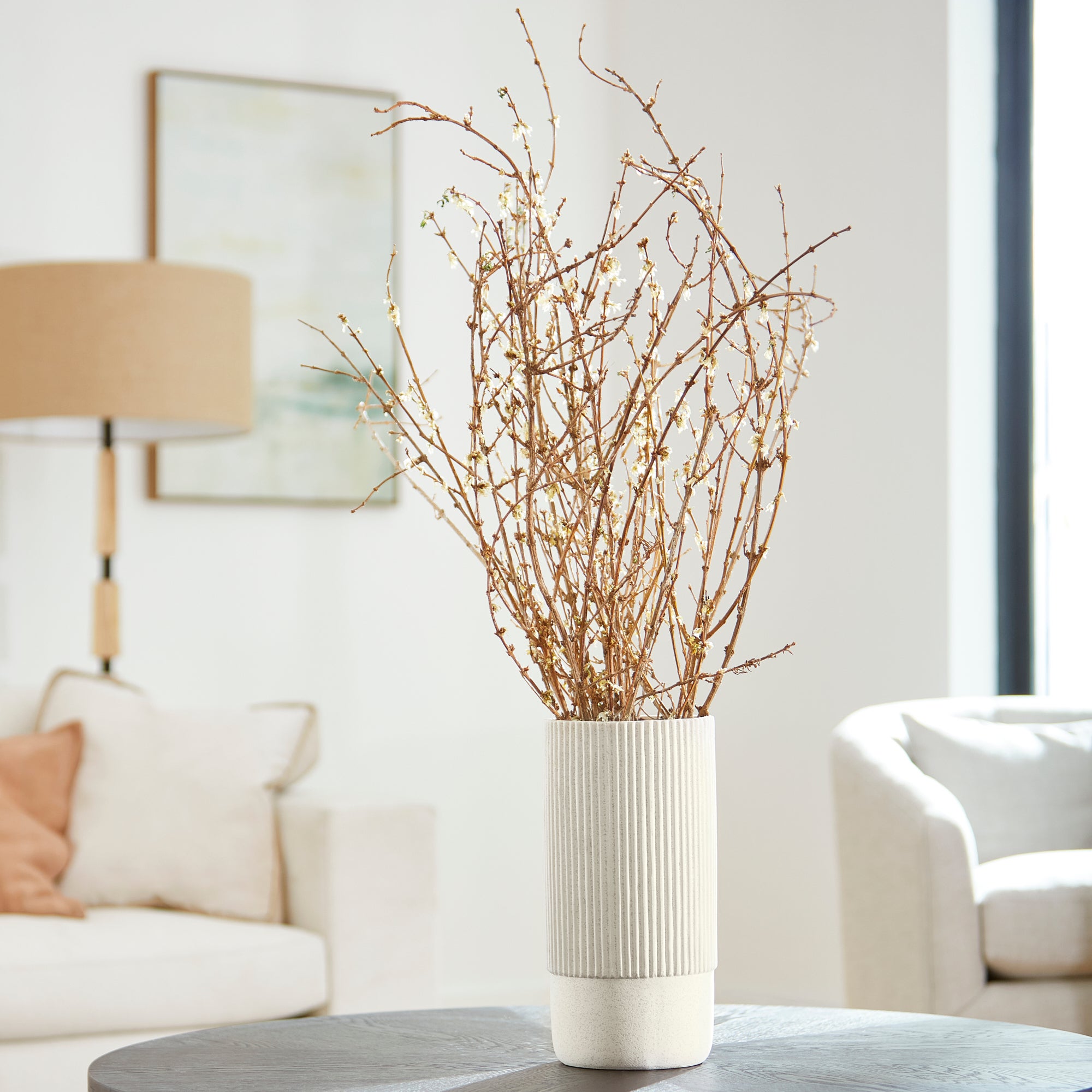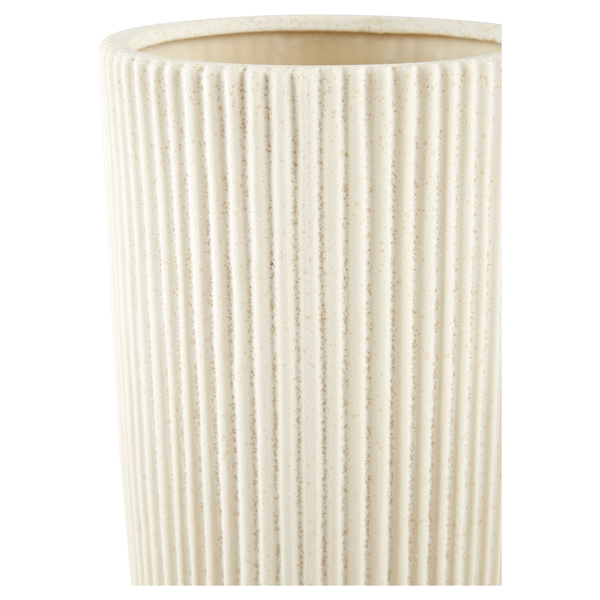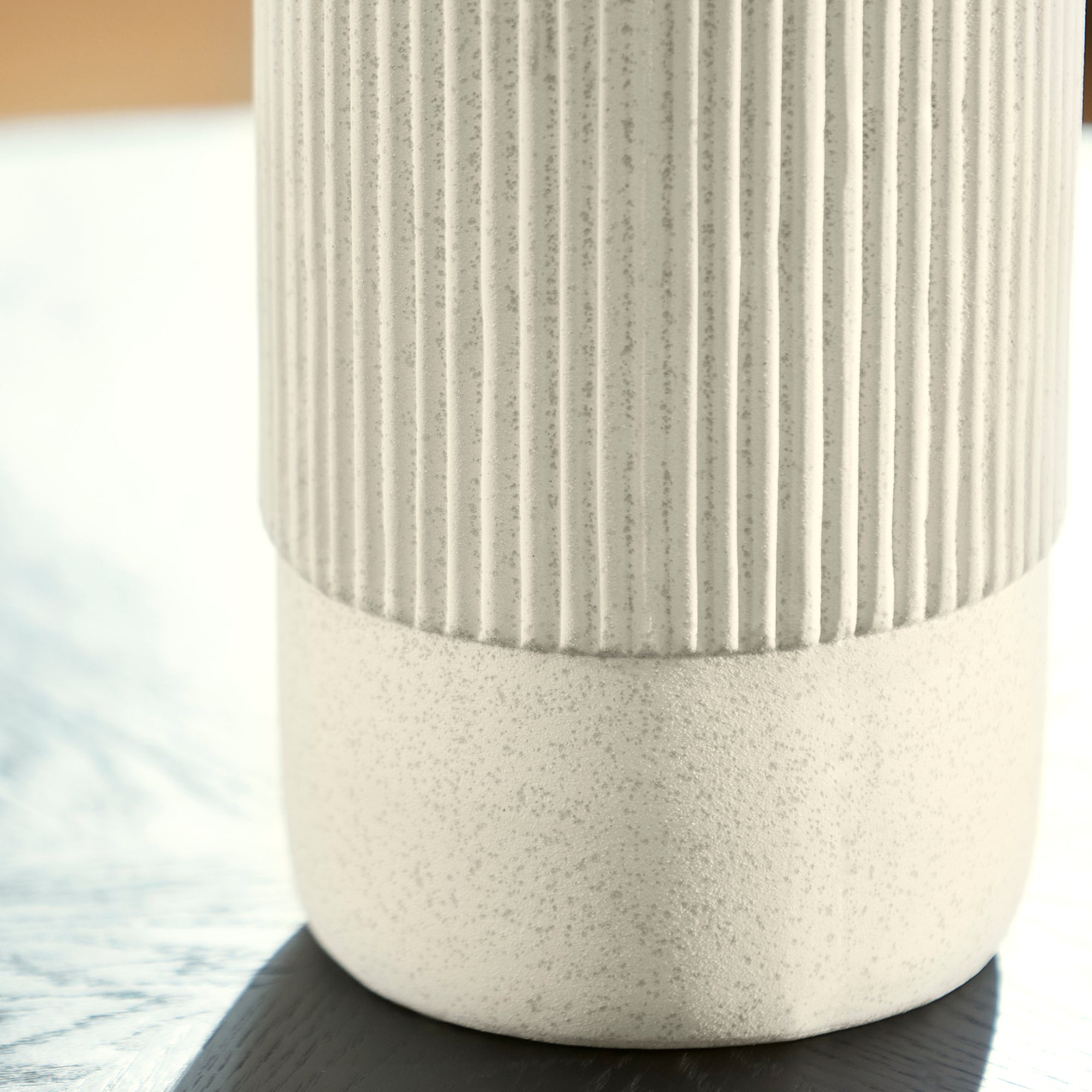 This vase’s body consists mainly of numerous ridges that begins at the brim and ends before the base begins. The base is a simple taper and possess a grainy texture in contrast to the glossy finish.