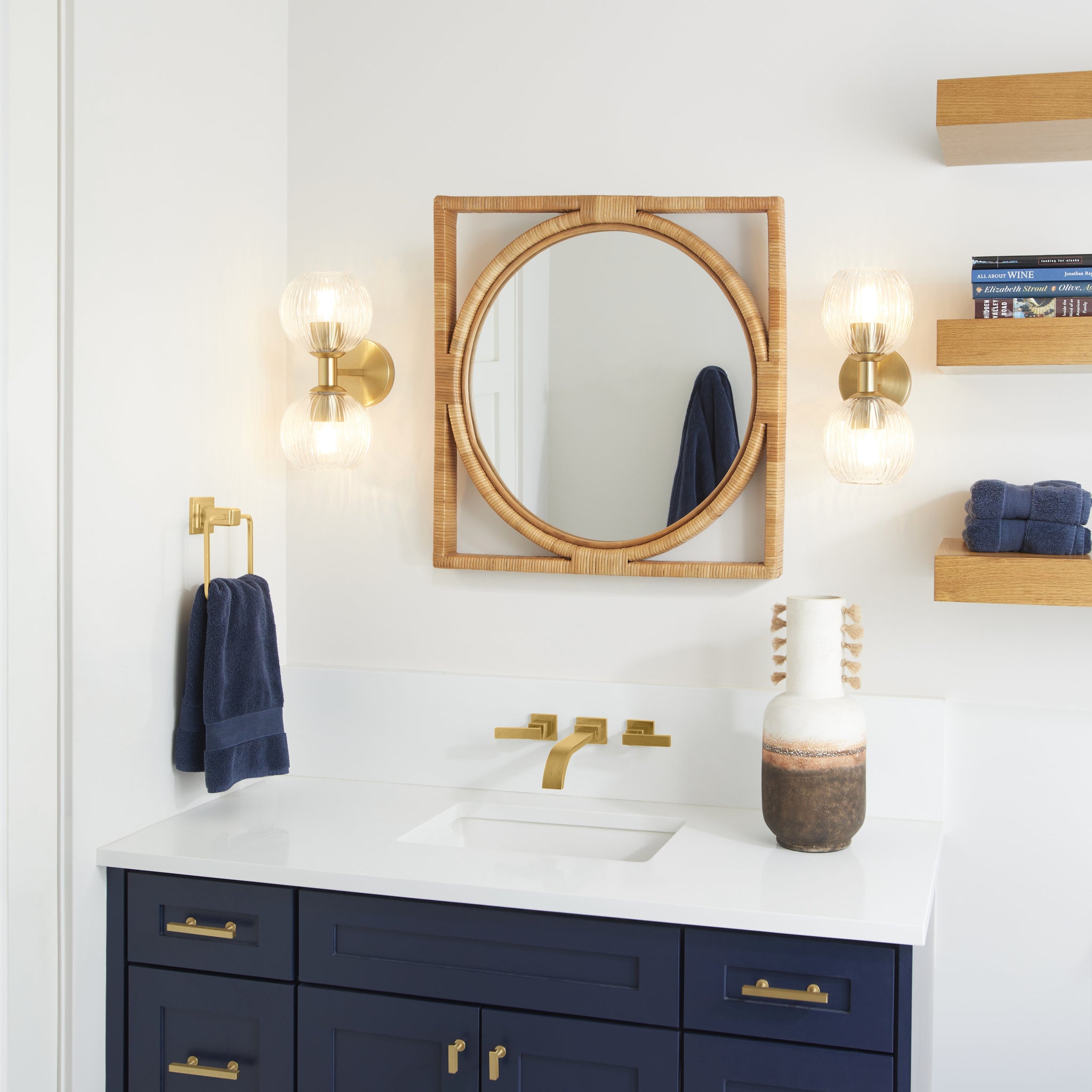 Luxurious and stunning, the modern Helios wall mount is characterized by its perfectly balanced, aged brass frame and its dual, up-light/down-light sockets. With bulbs neatly housed in clear, ribbed glass orb shades for an added touch of whimsy. The overall composition is futuristic and leans mid-century modern in its styling. This striking luminary comes together harmoniously in its eye-catching geometry and luxury appeal. Mount it on any living room wall for added illumination, or line a hallway with multiple fixtures to provide your guests with a guiding light.