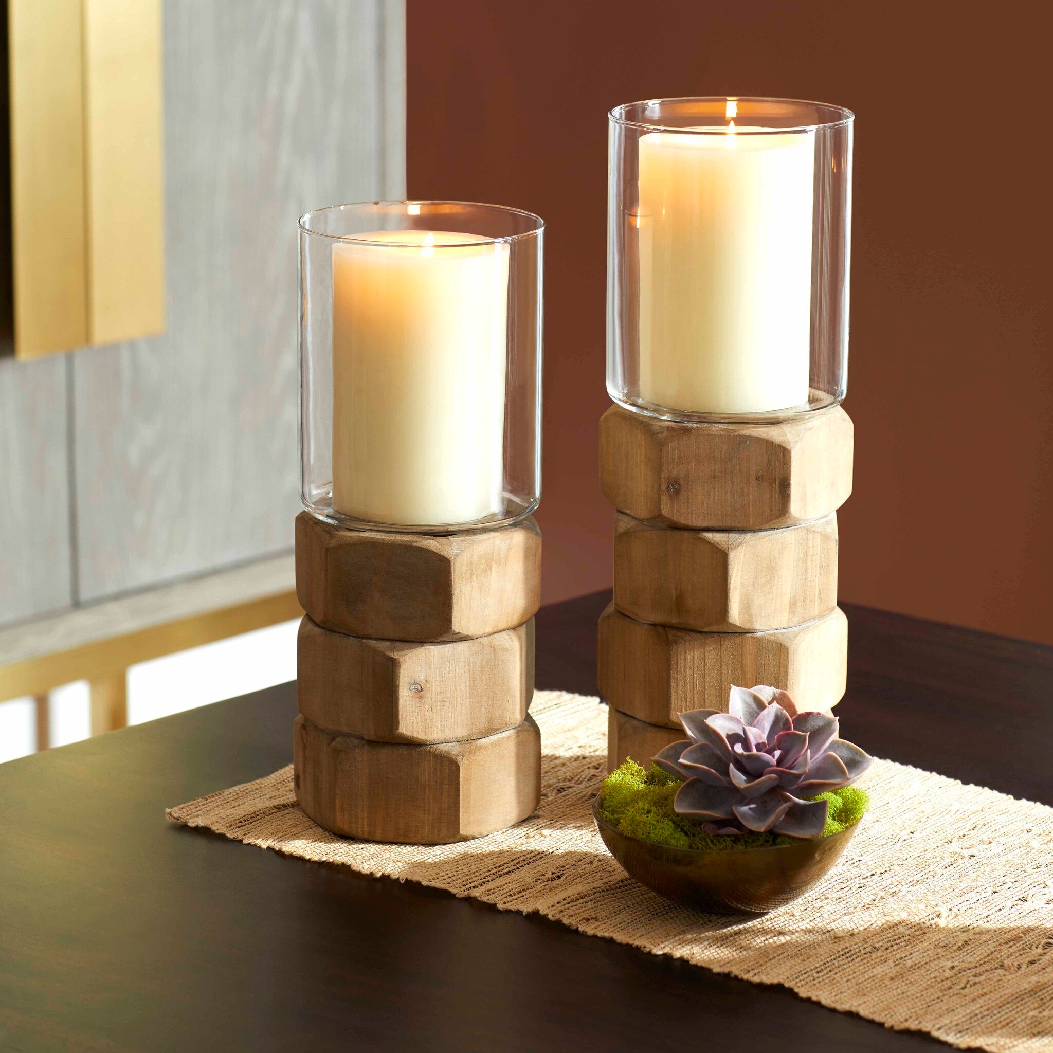 Transform your living room into a cozy cabin with this medium natural wood candleholder. Clean, asymmetrically placed angles are a contemporary detail that contrast with the smooth glass tube.