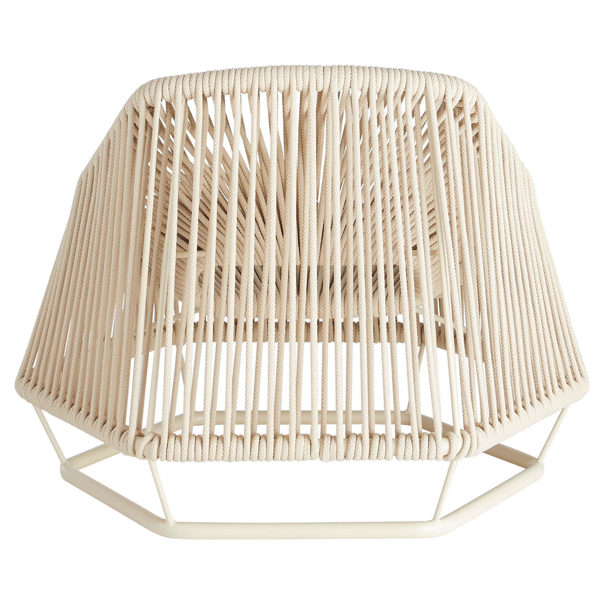 The Hexagon chair features a powder-coated aluminum frame wrapped in a 9mm biege nautical braided rope. It’s thoughtfully designed without the need for cushions, making it perfect for outdoor use. The nautical rope is abrasion-resistant, durable, and built to withstand the elements, ensuring a long-lasting piece of functional art.
