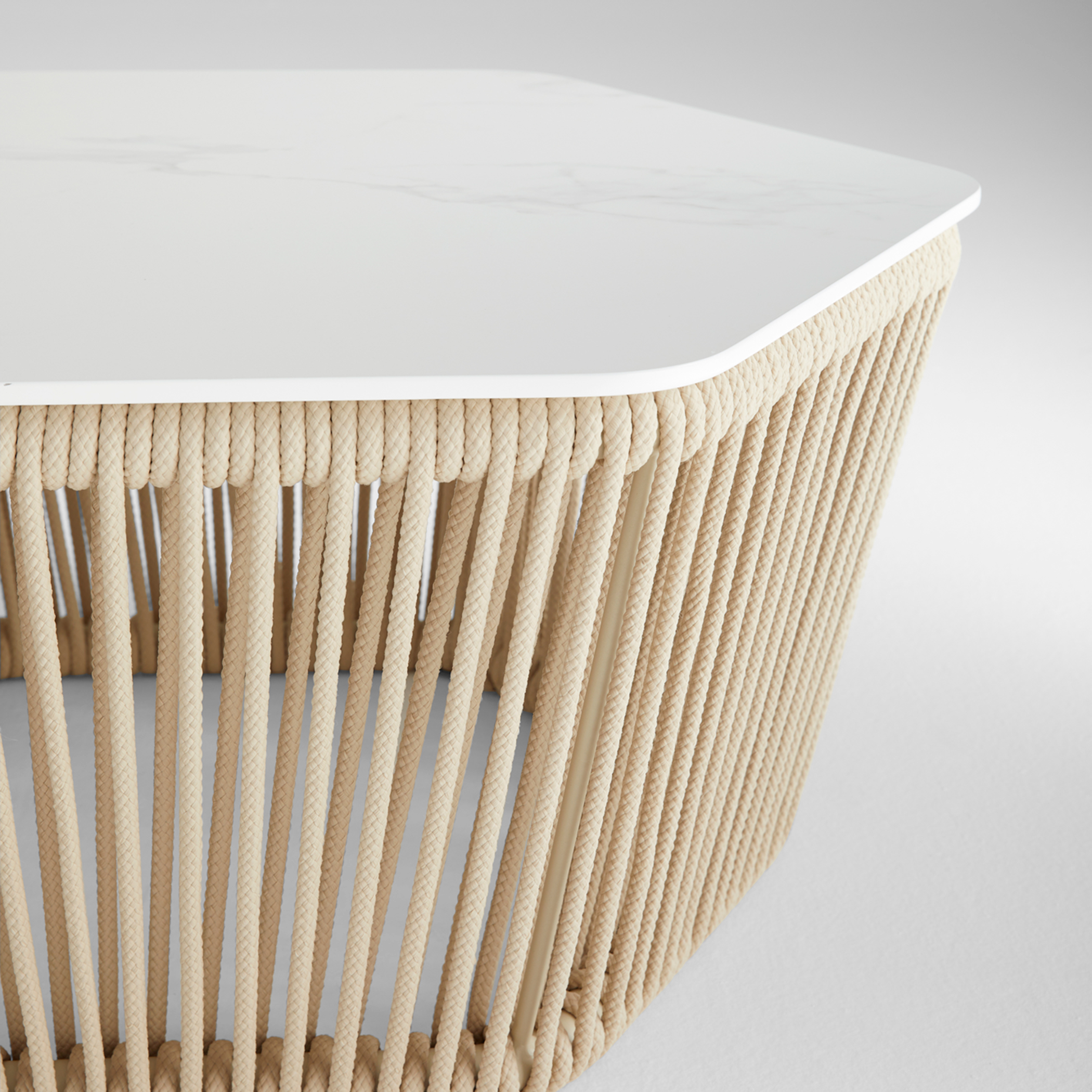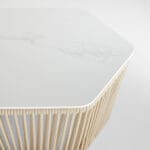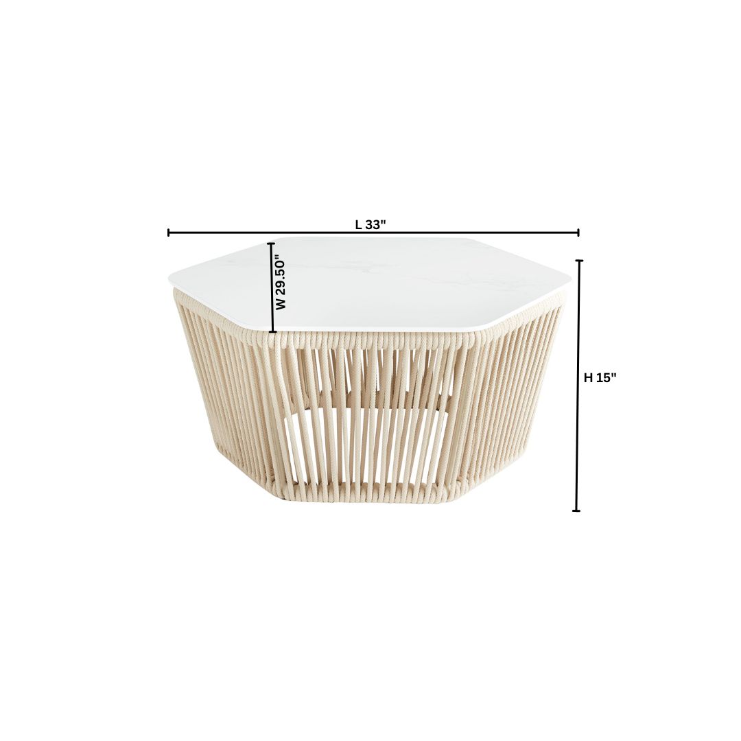 The Hexagon table features a powder-coated aluminum frame wrapped in a 9mm biege nautical braided rope. It’s thoughtfully designed with a white porcelain tabletop, making it perfect for outdoor use. The nautical rope is abrasion-resistant, durable, and built to withstand the elements, ensuring a long-lasting piece of functional art.