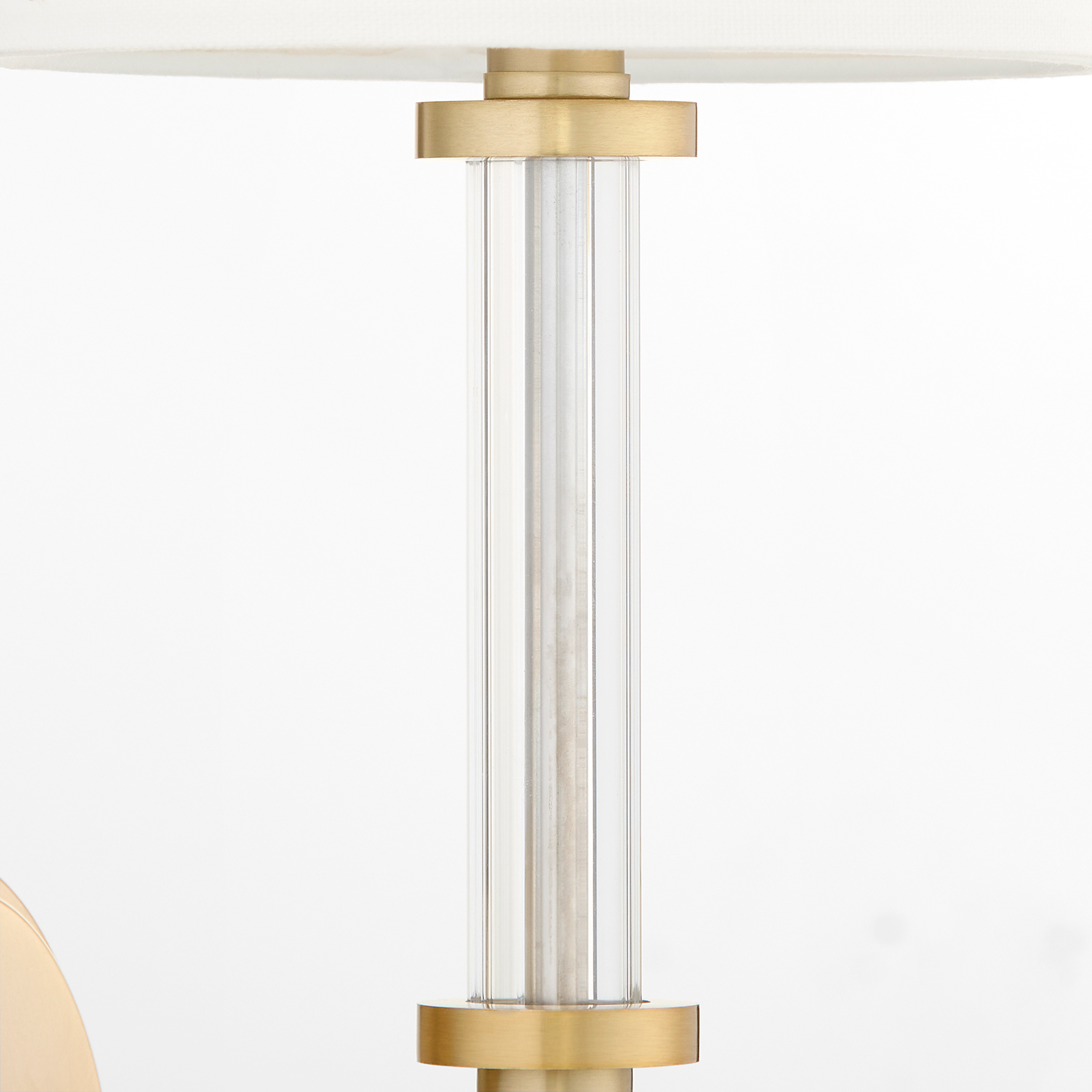 Ribbed clear glass tubes that surround classic arms contrast linen shades and provide a combination of materials for a dynamic presentation in the Hightower series of designer lighting. Aged brass and cream linen comprises a color palette that melds well with many design styles. Details throughout the frame and the stark change between the segments of materials offer a unique composition and memorable experience. Illuminate your next interior design project with the candelabra sockets of the Hightower series.