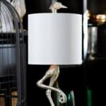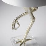 A long-legged ibis is the stunning centerpiece of this decorative table lamp. Beautiful in any space, this lamp features a cool silver-leaf finish over detailed resin construction. A white satin drum shade creates an inviting illumination for a favorite sitting area. This charming bird holds a crystal sphere in its talon, and rests on a acrylic base that delivers a touch of luxurious flair.