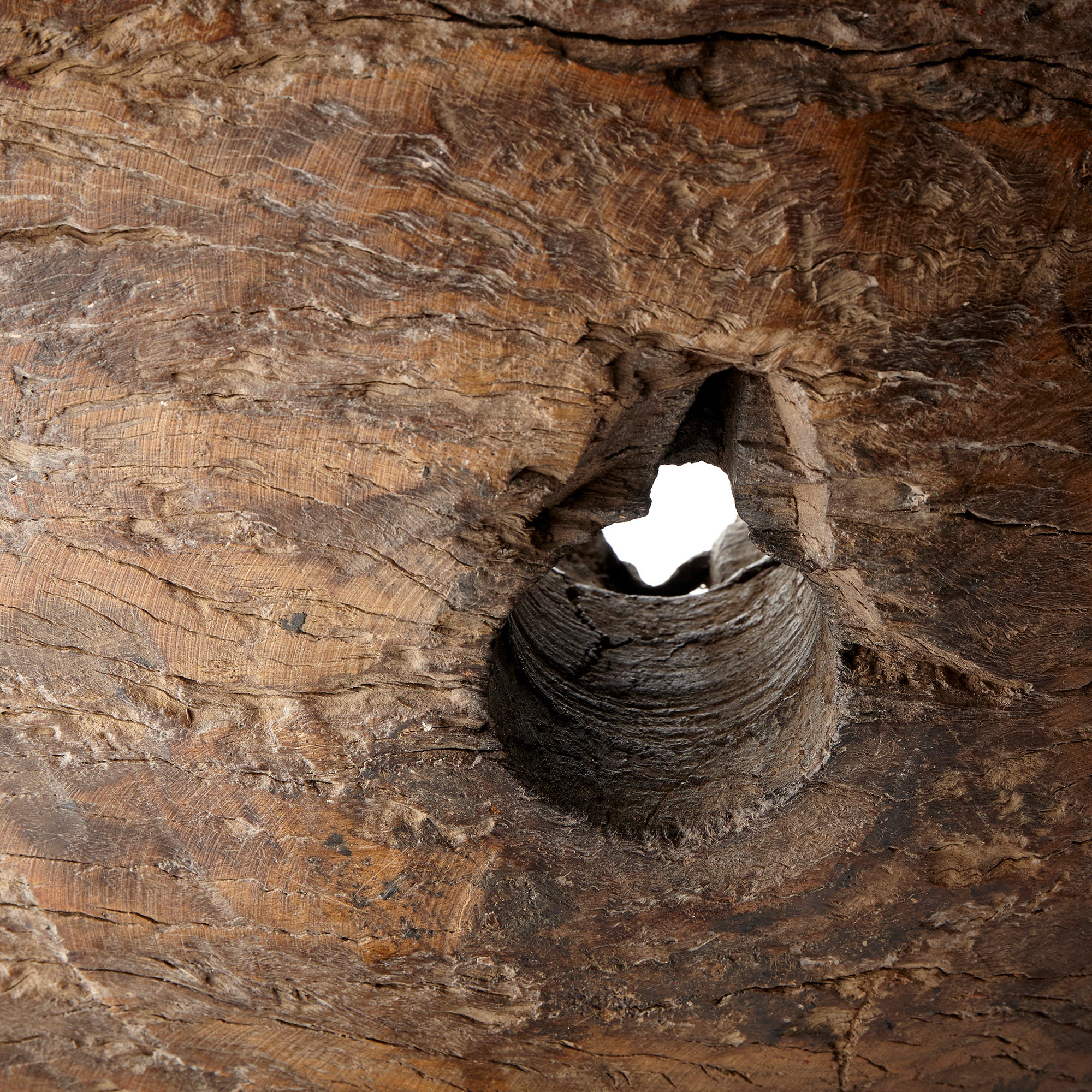 A round disc of wood in a rustic finish is set in a matte black stand to create this engaging abstract sculpture. Delightful in a living room, this piece features a small cut-out at its center, adding dimensional flair.