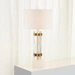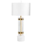 This table lamp’s elegant design adds a luxurious element to any space, with its aged brass base and beveled glass tube accents. Incorporate this piece`s brilliant, classic appeal by adding it to your living room or entryway ensemble. The one-light, three-way socket design coupled with a crisp, drum linen shade, make the Kerbos table lamp a perfect option for illuminating any home or commercial space.