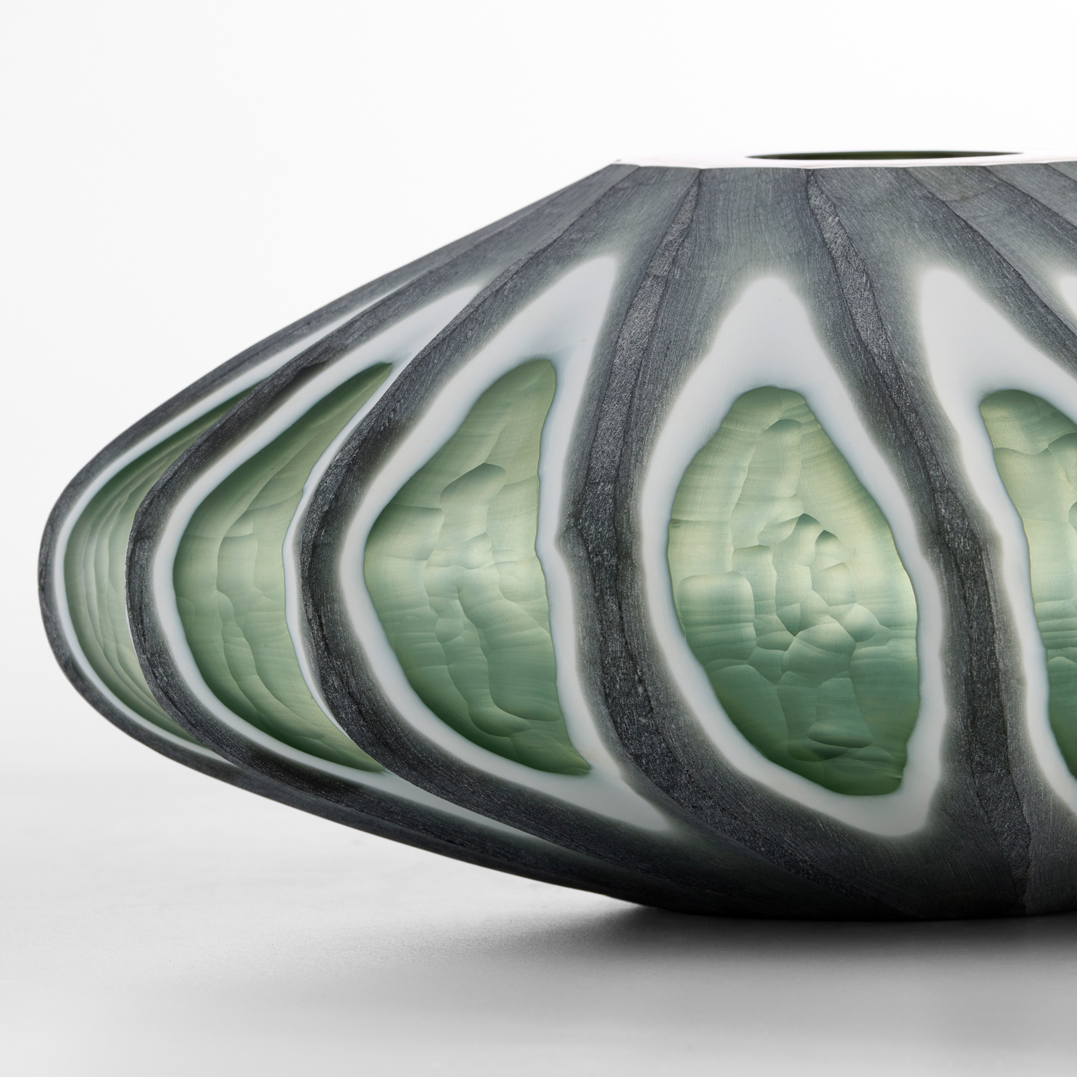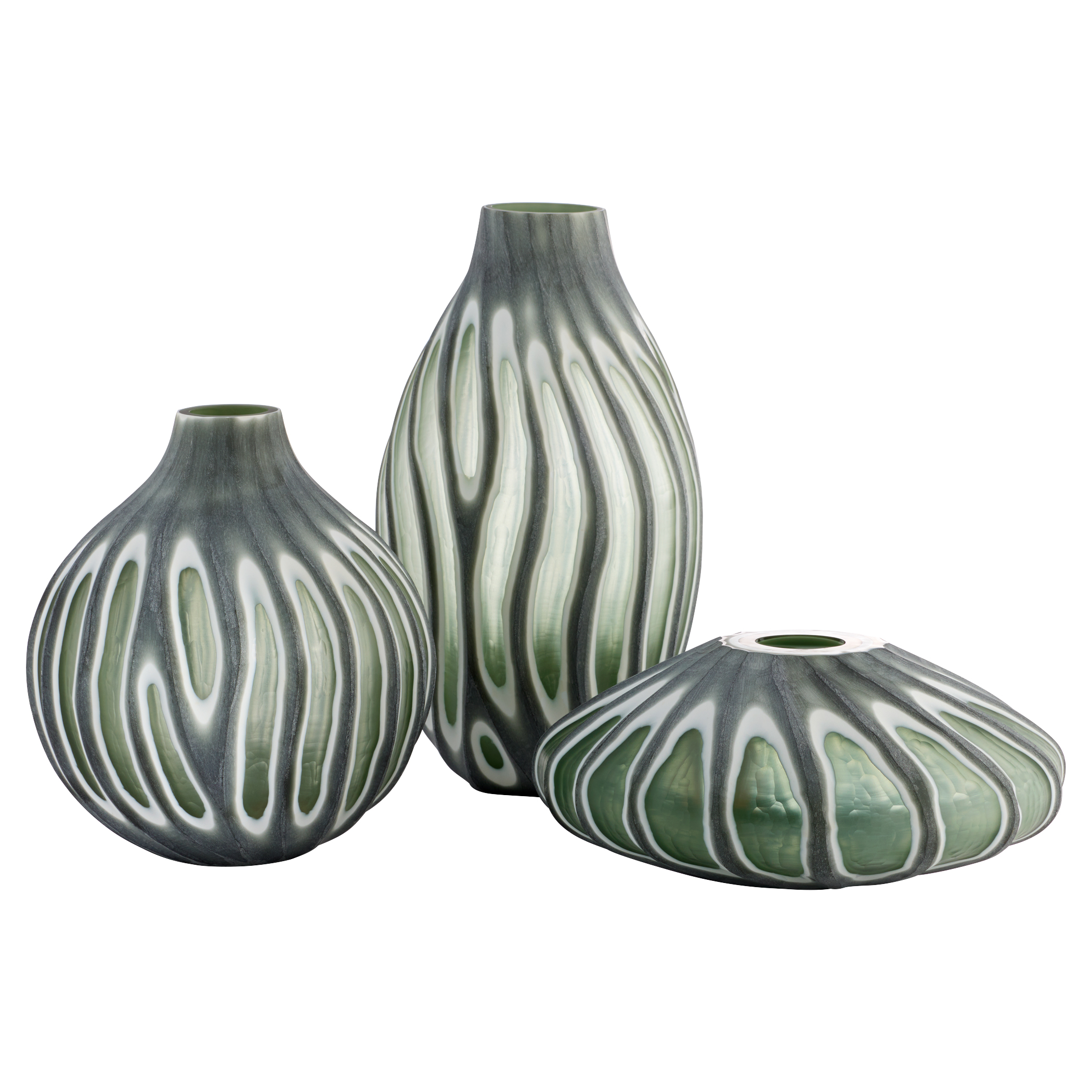 The Kombu Vases feature hand-carved glass with angled indents that reveal a striking three-dimensional pattern. The design flows seamlessly with the vase’s form, creating a sense of movement and liveliness. Available in three shapes and sizes, they make a dynamic display when arranged as a group.
