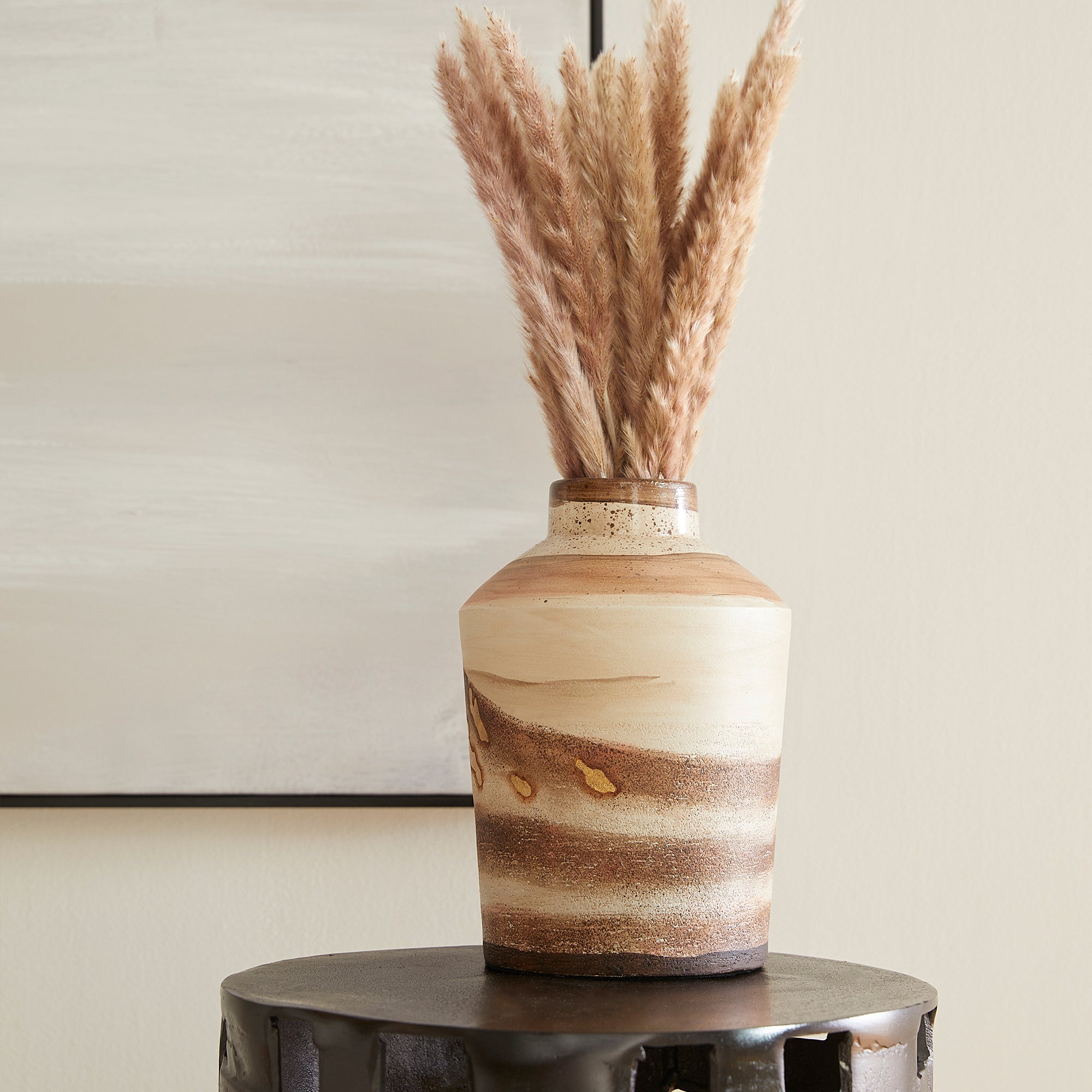 The layers of color through the ceramic pair of Kota vases resemble layers of earth forged over thousands of years. Strong enough to stand on their own or be adorned with fresh or faux foliage, these versatile vases will make a statement in any atmosphere they reside.