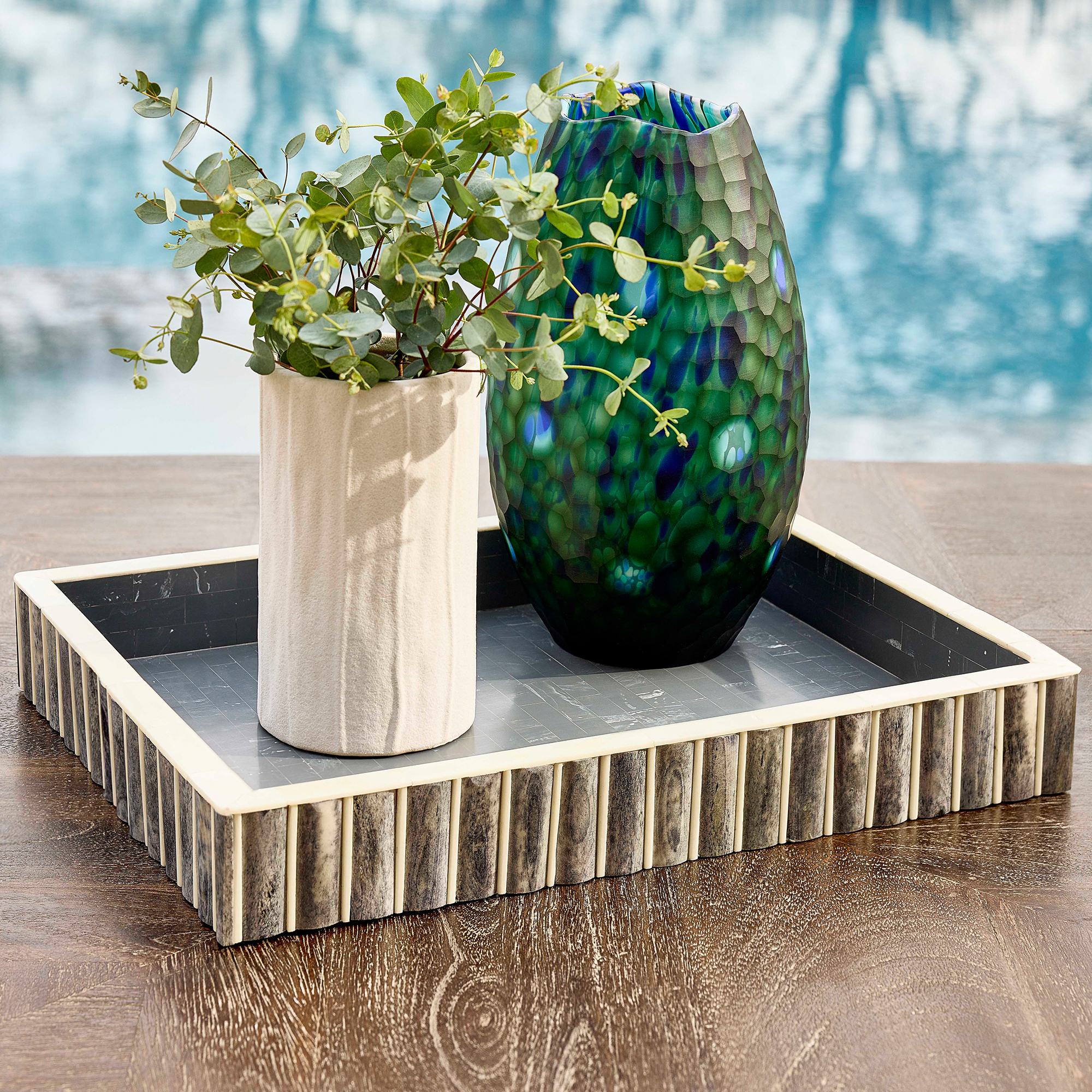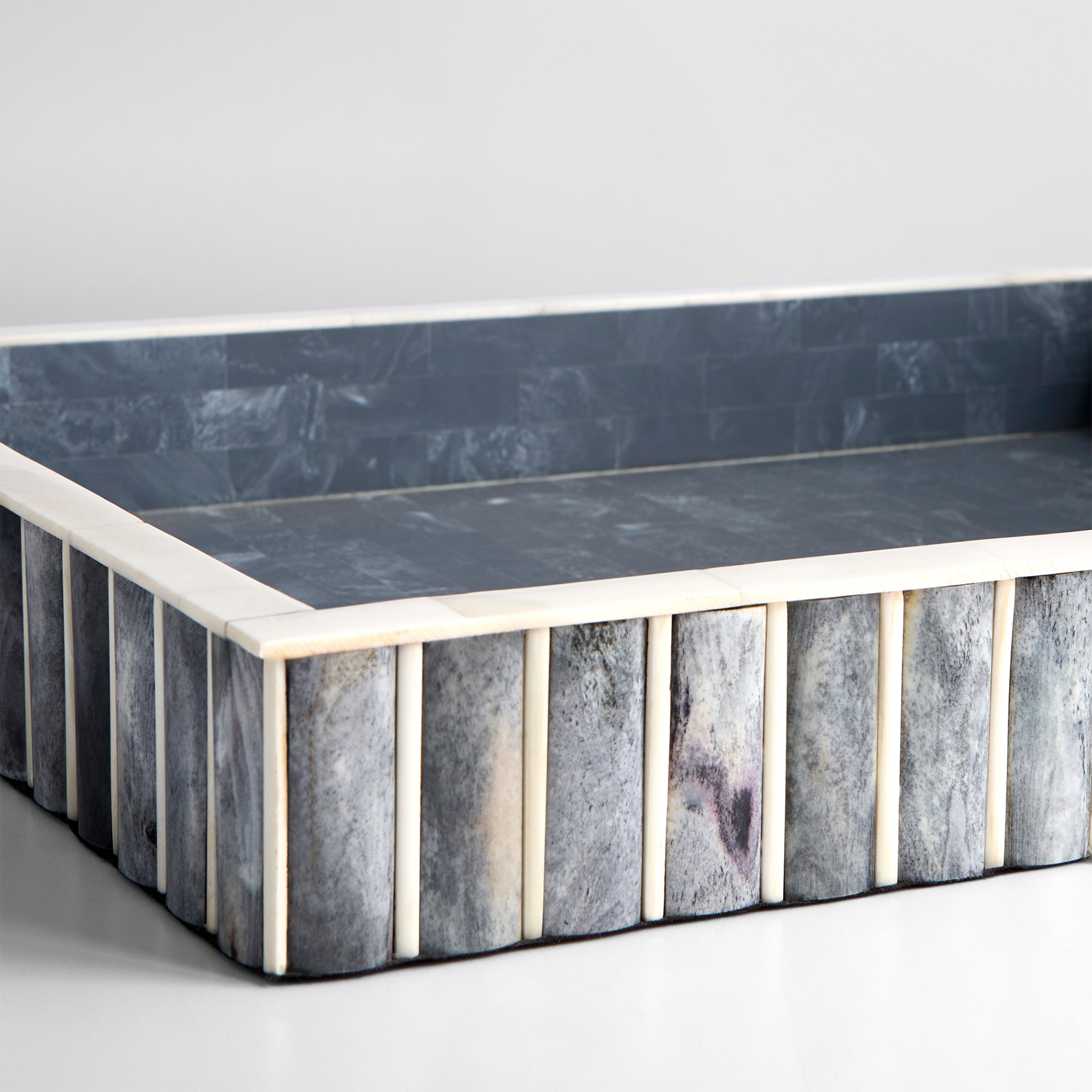 Crafted with care and precision, the Lapis Collection features trays with hand-cut natural and faux bone pieces meticulously arranged to create striking patterns. The gallery sides are fluted pieces of dyed bone flanked by smaller pieces of white bone to showcase their natural curvature, punctuated by a white bone gallery rim. These trays are lined with faux bone, ensuring every aspect is thoughtfully considered. These exquisite trays demonstrate seamless craftsmanship and attention to detail. Available in two sizes.