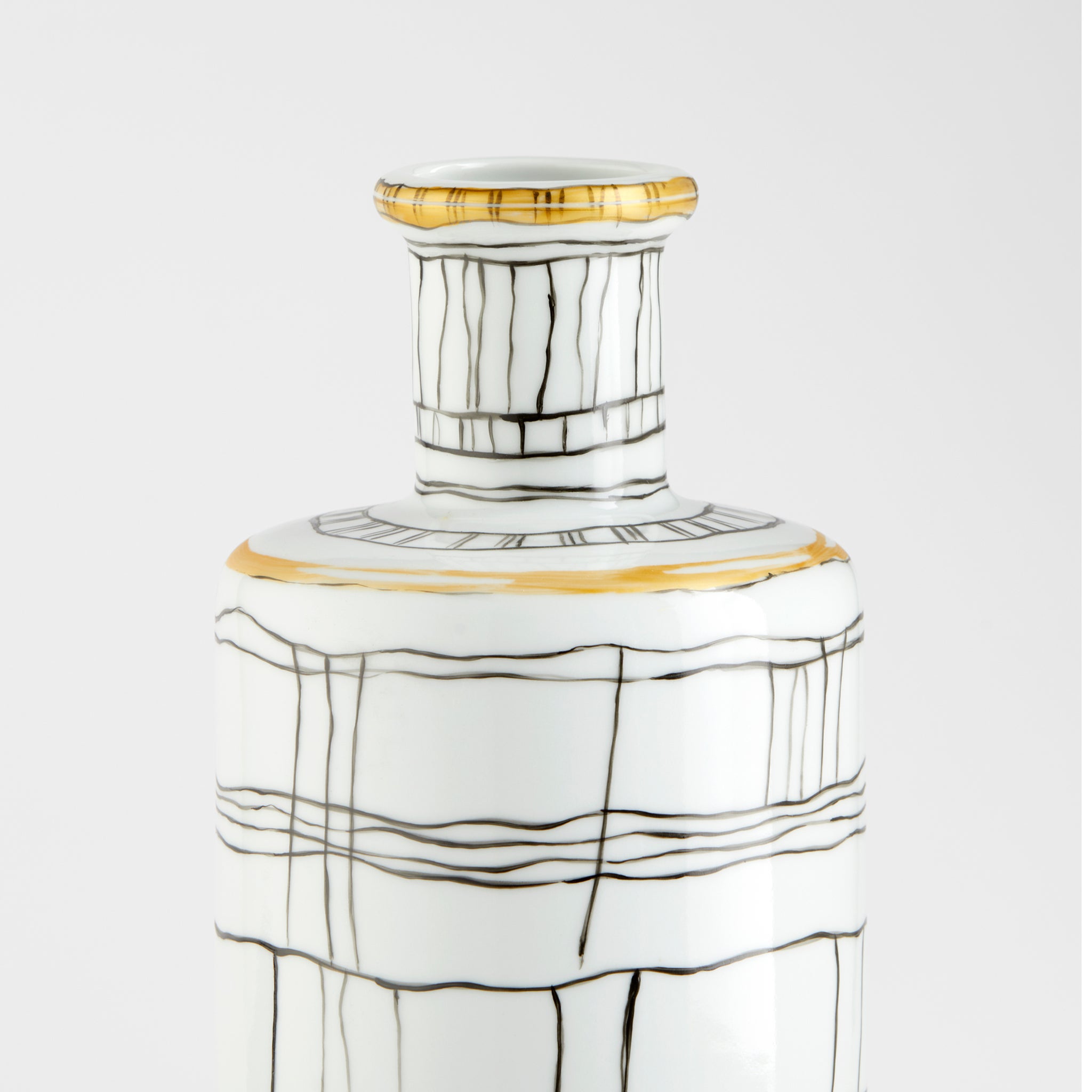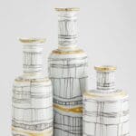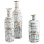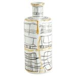 A glossy white base boasts irregular calligraphic lines with gold metallic embellishments, giving the Lindus vases an instinctively artful overture. Intersecting lines weave together to create a display of rudimentary elegance on a slender, cylindrical body. The Lindus vases are composed of ceramic and are available in three sizes.