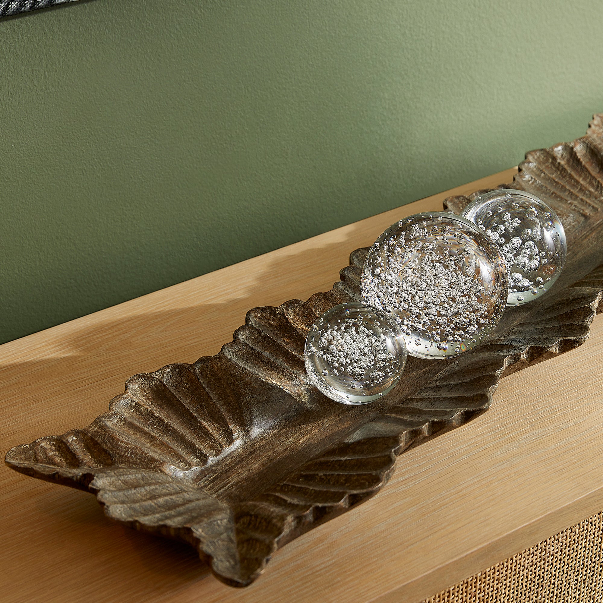 Ideal for entertaining, the Lorenza tray is large in scale and bears intriguing detail fit for any tablescape. Hand-carved Mango wood is sculpted into a long, rectangular shape with a ruffled border surrounding the center of the tray. The natural appeal of the Lorenza tray grants it the opportunity to support many different stylings.