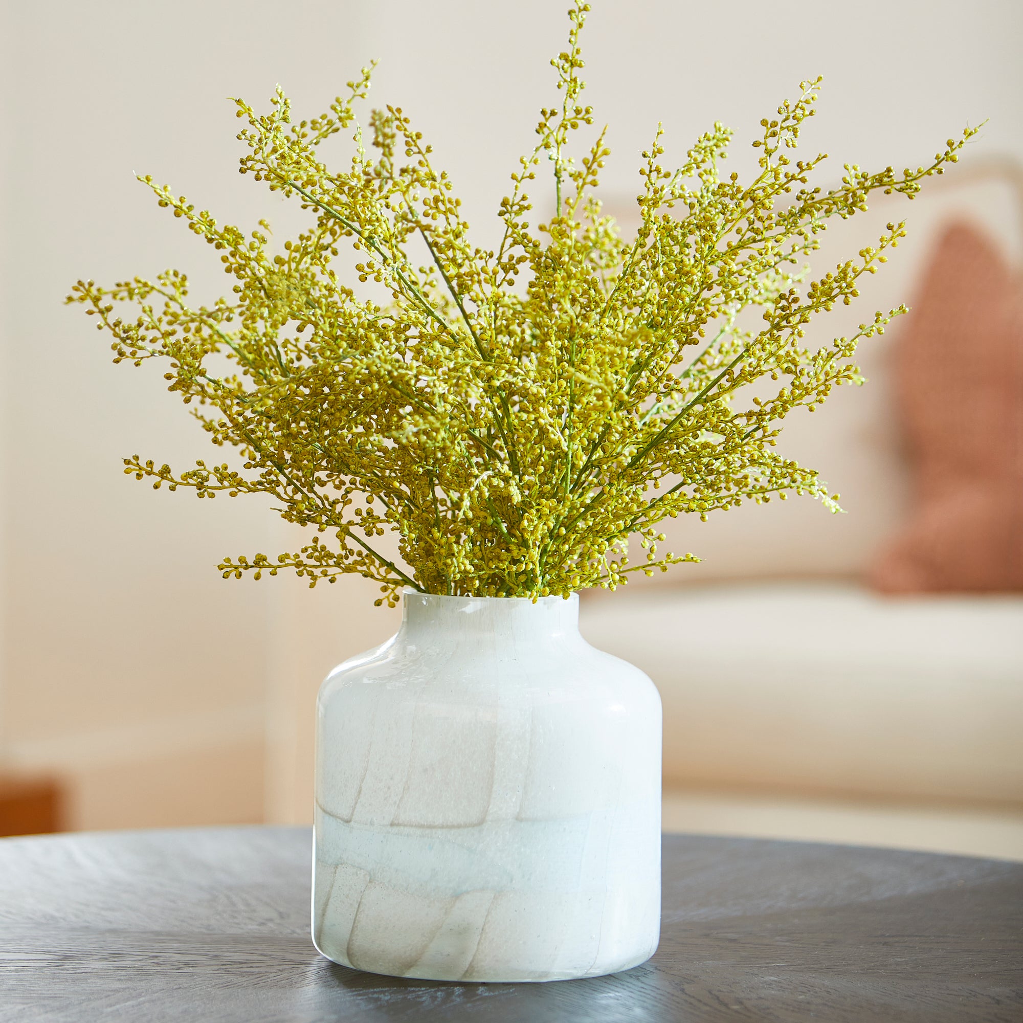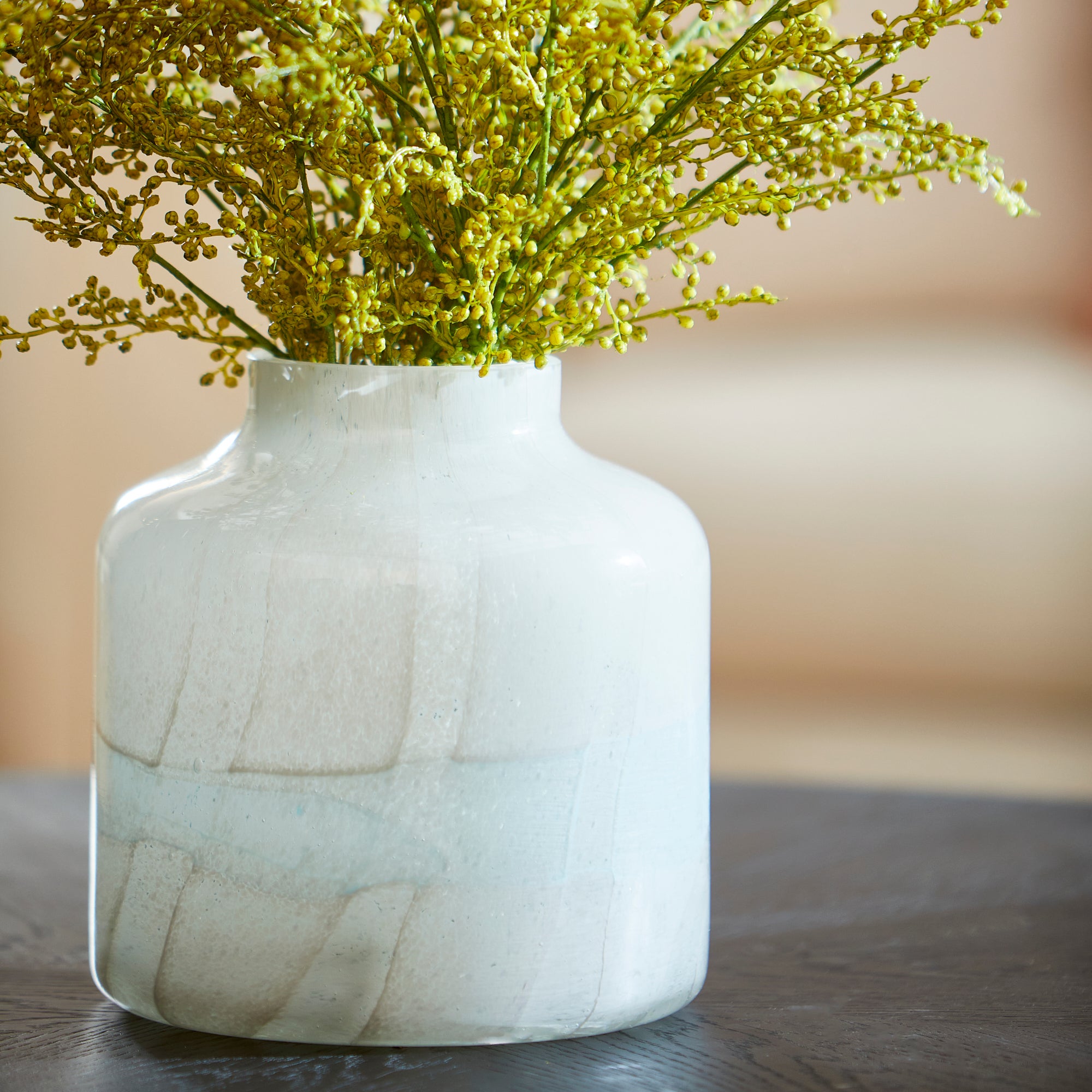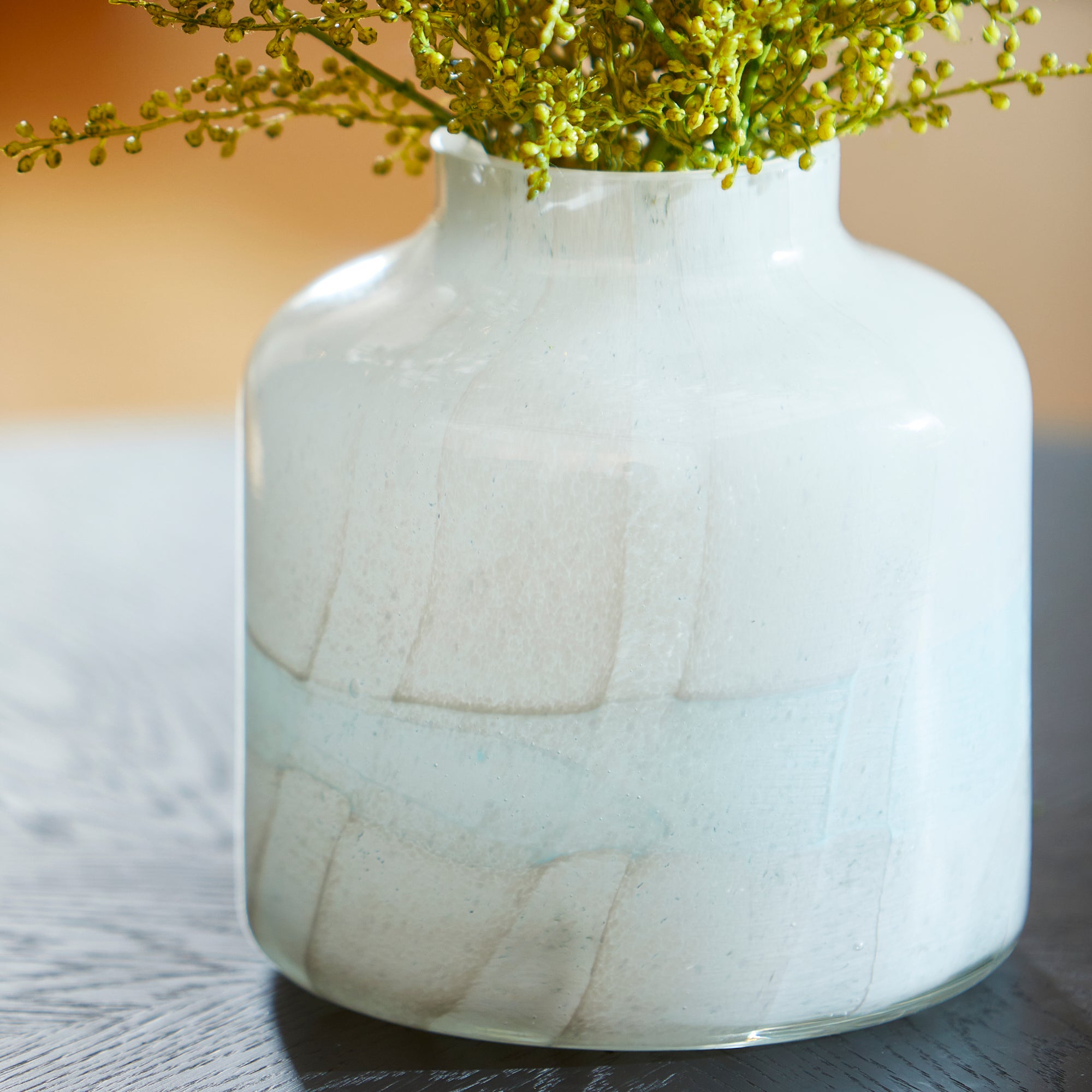 The Lucerne vase is an exceptional addition to any transitional or bohemian themed ensemble. The wide-base tulip silhouette boasts a glaze coated, tan and aqua surface finish. This whimsical vase is ideal for storing floral arrangements, decorative twigs, or displayed as a standalone accent. Available in two size options that lend themselves right at home on any living room coffee table, kitchen island counter, or commercial lobby display.