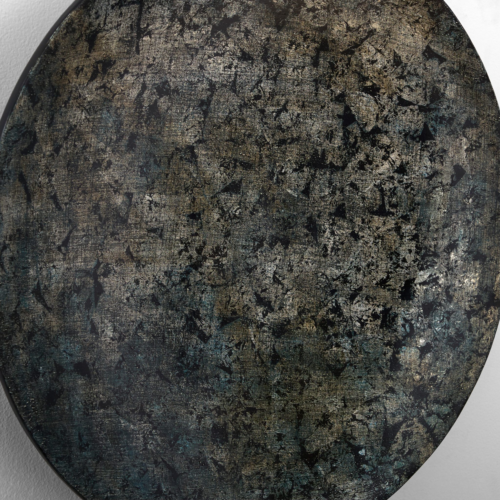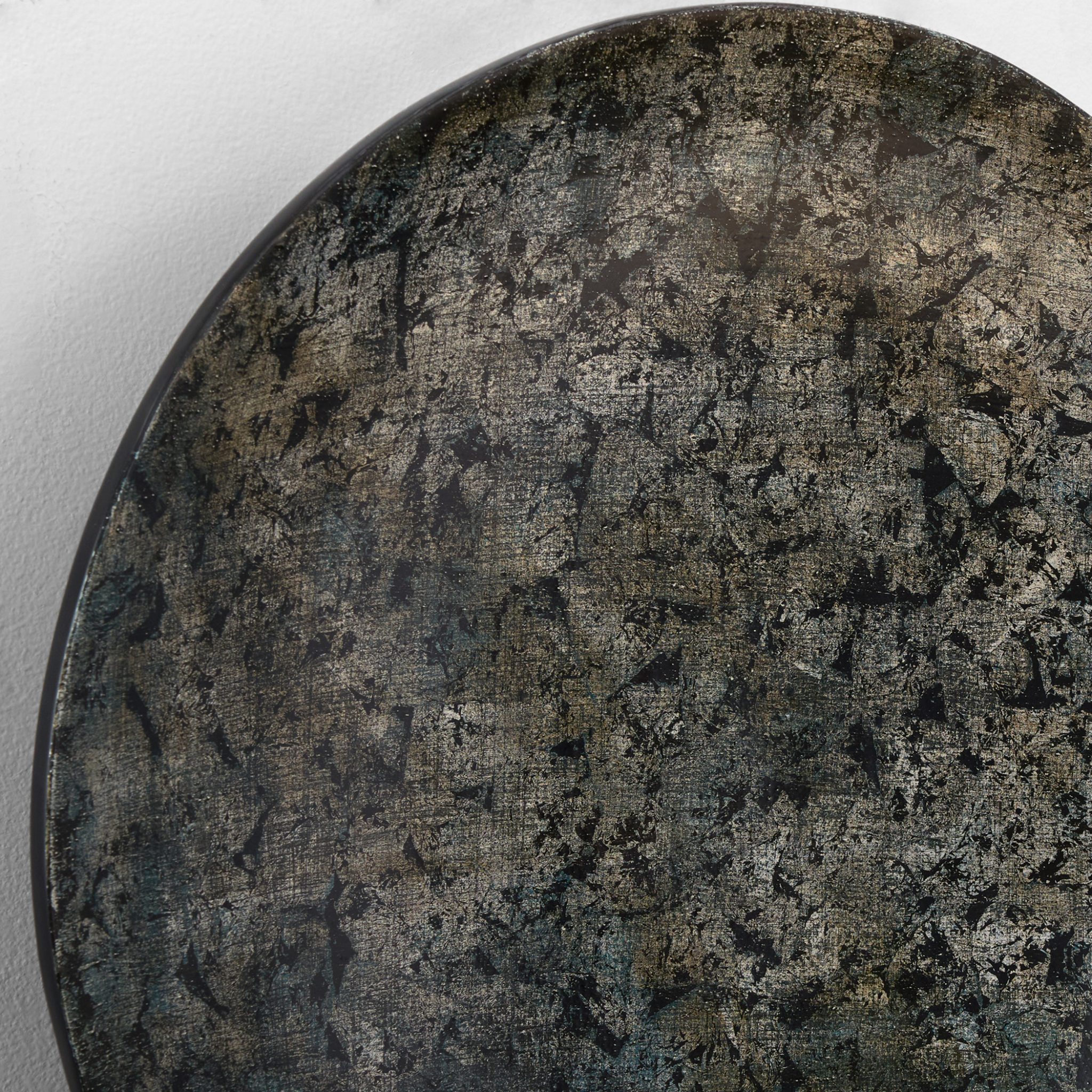 Inspired by abstract artistry, the Lunar Round Wall Art blends layers of black, blue, and silver for a striking visual effect. Hand-painted on spun bamboo disks, this versatile piece can be displayed as wall d?cor using the built-in keyholes or used as a striking tabletop charger (not food-safe). Dust with a dry cloth for easy maintenance.